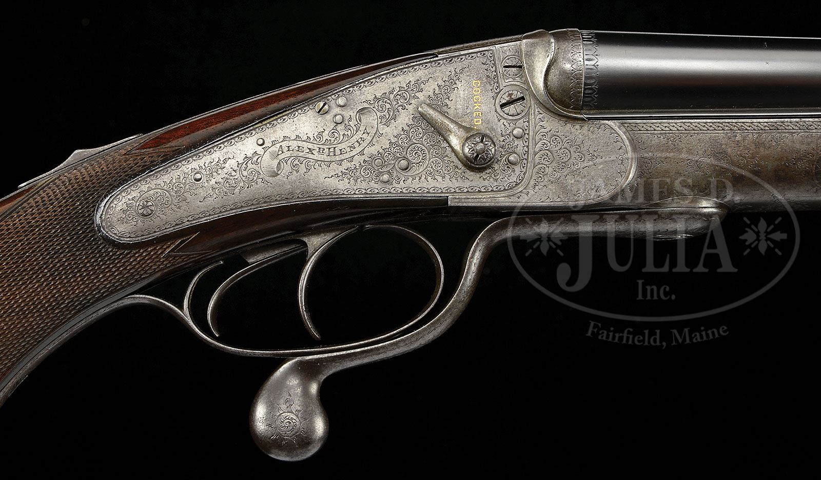 ALEXANDER HENRY HAMMERLESS UNDER-LEVER DOUBLE RIFLE. SN 6473. (1891) Cal. .450 BPE. 28″ Dovetailed bbls have full length file cut rib, engraved “Alexr Henry Edinburgh & London.” and mounted with one standing, one folding express rear sight and longitudinally dovetailed front bead. Bbl flats are stamped with London black powder proofs, SNs, “AH” and “450 EX”. Jones under lever hammerless action (operation of under lever cocks locks) is fitted with back action hammerless locks and features automatic safety and long armed cocking indicators, which cover a gold inlaid “COCKED” when in fired position. Action has well filed fences and is engraved with 60% coverage well cut small scroll. “Alexr Henry” is on scrolled ribands on each lockplate. Top of action is engraved “Henry’s Patent no. 207″. Trigger guard with central portion of bow cutaway to accept operating lever, has SN at grip. Lightly figured European walnut full horn capped pistol grip buttstock measures 14-9/16″ over checkered wood butt with engraved steel heel and toe plates. Point pattern checkering is at grip, and a sling eye is on toe line. Matching splinter forend is fully checkered, and has front pivoting release. Drop at heel: approx 3″, drop at comb: approx 1-15/16″. Weight: 8 lbs. 9 oz. LOP: 14-9/16”. CONDITION: Very good, as partially refinished. Bbls retain nearly all of a high quality satin re-blue, engraving picked up. Action and lockplates are mostly pewter gray patina. Wood refinished, and retains nearly all of that finish with a number of minor marks. Checkering is re-cut and sharp. Bores have strong rifling throughout, but are frosted with some pitting. Action is slightly loose. Bbls are off face. These scarce sporting rifles often show heavy use, as they were taken to the “ends of the earth” mostly in sultry, tropical environments. 4-48314 MGM73 (7,000-9,000)