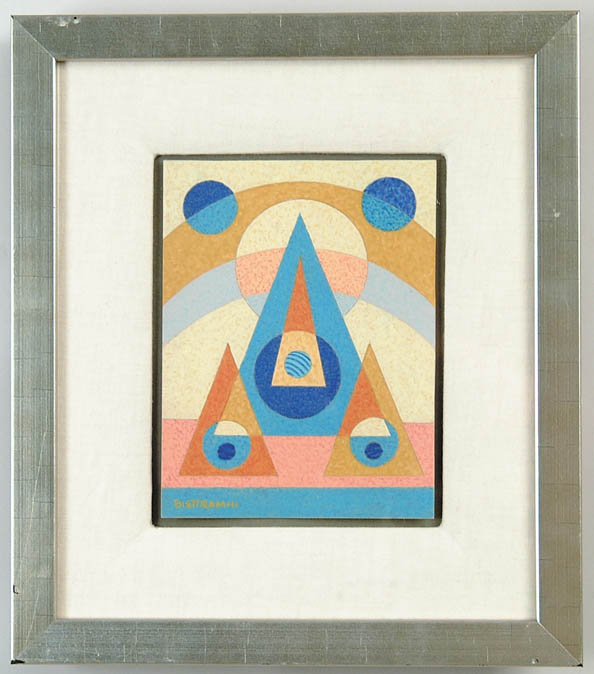 EMIL JAMES BISTTRAM (American, 1895-1976) GEOMETRIC ABSTRACT II. Oil on paper abstract with geometric shapes including triangles and circles. Colors of gold, blue, tan and rose. Signed lower left “Bisttram 41”. Housed in a modern silver gilt wood frame with wide linen matte. SIZE: 8” x 6”. CONDITION: Very good. 9-94290 (3,000-5,000)