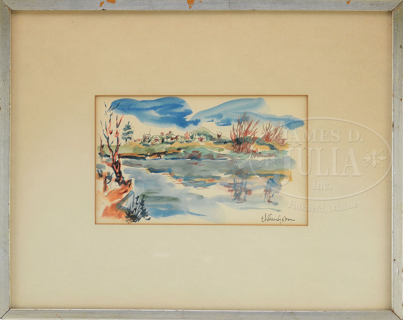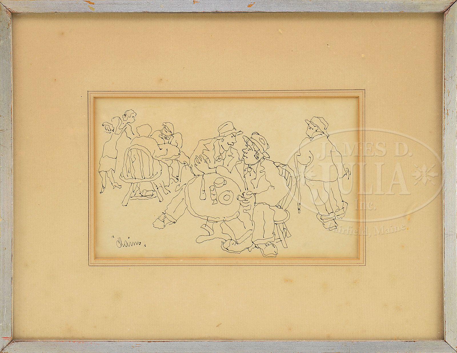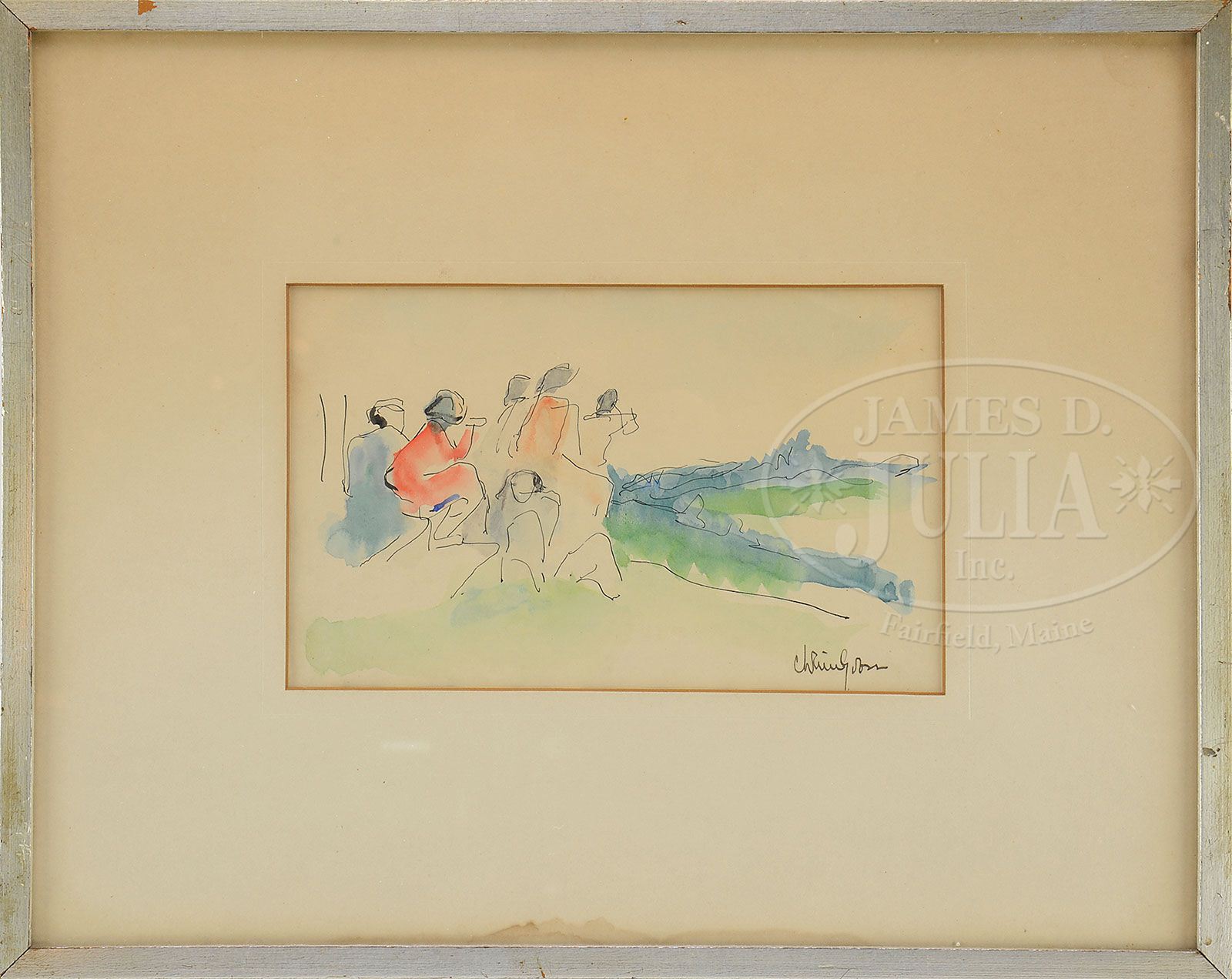 CHAIM GROSS (American, 1904-1991) FOUR WORKS: FIGURES AND LANDSCAPES. Two watercolors & two pen and ink Identically housed in simple silver wood frame with mats and glass (mattes as is) Watercolor signed “Chaim Gross”, lower right. Drawings signed “Chaim”, lower left SIZE: Watercolors: 5″ x 7″. Drawings: 4-3/4″ x 7-3/4″. CONDITION: Light foxing and toned, not examined out of frame 9-27235 (800-1,600)