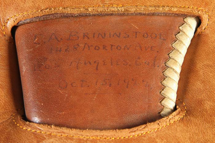 CARVED LEATHER HOLSTER & BOOKS FROM E.A. BRININSTOOL. Earl Alonzo Brininstool, 1870-1957, was from Warsaw, NY and in 1895 moved to Los Angeles where he became a journalist working for local newspapers and later freelanced for newspapers, wrote western poetry and articles for magazines. Most of his work dealt with Custer & the Little Big Horn Battle. He compiled several stories of survivors of the Reno command, some of which he turned into fictional accounts in his numerous books. Brininstool gave the holster, gun and book to P. Vosburgh. Vosburgh was a friend of the consignor’s family and is how the consignor acquired the items. Beautiful russet brown, carved, leather holster with fine, deep foliate & floral patterns with wide oval skirt and sgl loop, all lined with fine kid skin. The loop has the initials “EAB”. Rear edge of holster is light colored buckstitch laced and attached to the skirt at the toe. It has a small hole at the bottom of the skirt with a buckskin thong. Back side of holster, in the opening of the skirt, is inscribed in pen “E.A. BRININSTOOL / 1428 NORTON AVE. / LOS ANGELES, CAL. / OCT. 15, 1922”. CONDITION: Very fine. Retains most of its orig finish with some slight scuffing to the front and minor wear to the lining at top of fold. Accompanied by three of Mr. Brininstool’s western books with dust covers: A) Trail Dust of a Maverick, 1921, inscribed “To my friend P. Vosburgh” and author signed & dated “March 12 / 24”. Very good condition. Minor bug damage to dust jacket & some yellowing. B) Troopers With Custer, 1925. Fine condition. Minor damage to back of dust jacket with some yellowing. C) Fighting Indian Warriors, 1953. Very fine condition. Slight yellowing. Ex Murray Peterson Collection 4-30590 JR371 (1,500-2,500)
