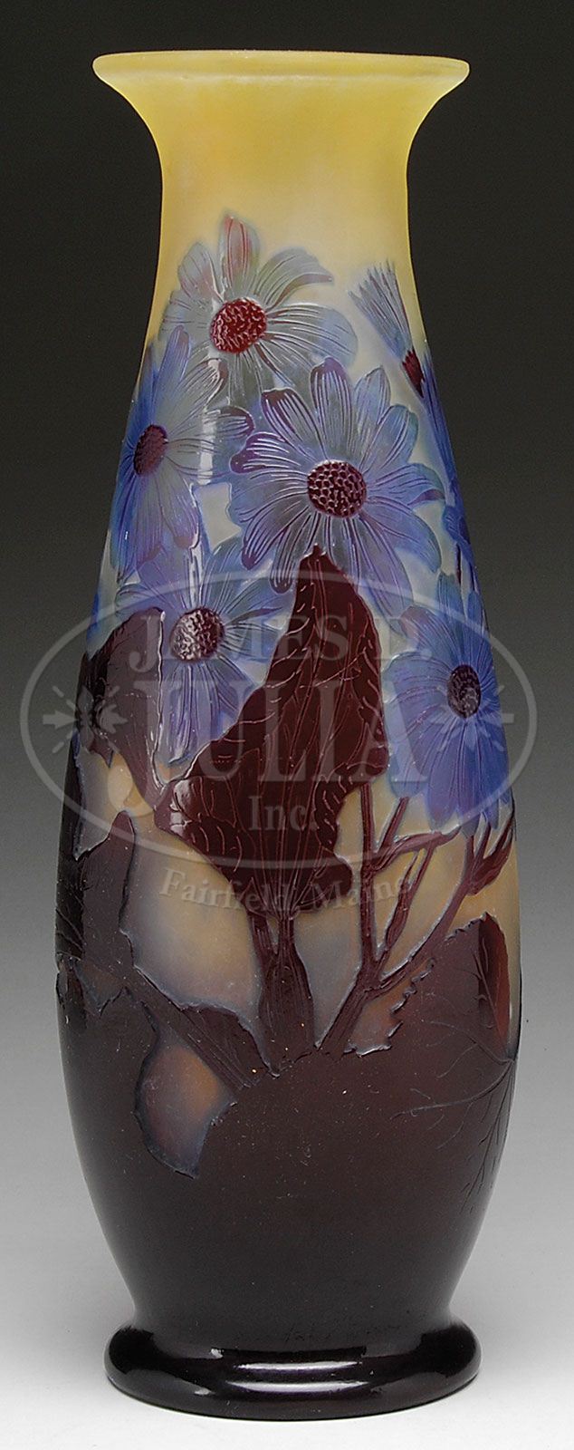 GALLE FRENCH CAMEO FLORAL CAMEO VASE. Beautiful Galle vase is decorated with brown cameo leaves and stems leading to light blue cameo flowers done in the windowpane technique. All set against a shaded yellow background. Vase is signed on the side in cameo “Galle”. SIZE: 12-1/2″ t. CONDITION: Very good to excellent. 5-65652 (4,500-6,500)