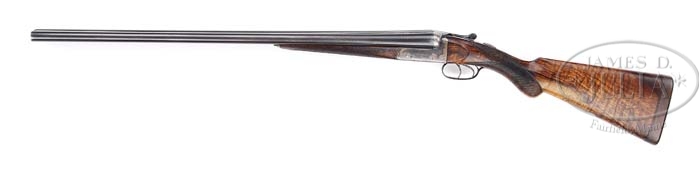 *W & C SCOTT SCREW GRIP BOX LOCK EJECTOR GAME GUN. SN 86879. Cal. 20 Ga. 2-1/2″ Chambers. 26″ Dovetailed bbls are engraved “W & C. Scott & Son. 78 Shaftesbury Avenue. London.” on concave game rib. Bbl flats have SN and Birmingham nitro proofs for 20 gauge 2-1/2″ chambers. Case hardened box lock action features automatic safety (“safe” inlaid in gold), double triggers, bushed strikers, and screw grip third fastener. Unadorned action has “W & C. Scott & Son” on both sides. SN is on trigger guard tang. Very nicely streaked and figured European walnut semi pistol grip buttstock measures 14-1/16″ over leather covered pad and features vacant silver oval, and 20 LPI flat top checkering with mullered borders. Anson release splinter forend matches buttstock. Bore diameter: left -.619, right -.618. Bore restrictions: left -.025, right -.002. Wall thickness: left -.044, right -.040. Drop at heel: 2-15/16″, drop at comb: 1-3/4″. Weight: 5 lbs. 10 oz, LOP 14-1/16″. CONDITION: Fine. Bbls retain 80% original blue, thinning where carried, and around breeches. Action retains 60-70% case color. Floor plate, trigger guard and top lever have been re-blued and retain most all of that blue. Stocks appear to have been refinished a long time ago. Checkering is somewhat worn and dirty. Pad is new. Ejectors are in time. Great handling little field gun. Needs a bit of T. L. C. 4-38686 MGM35 (4,500-7,500)
