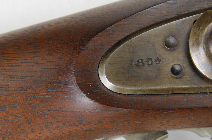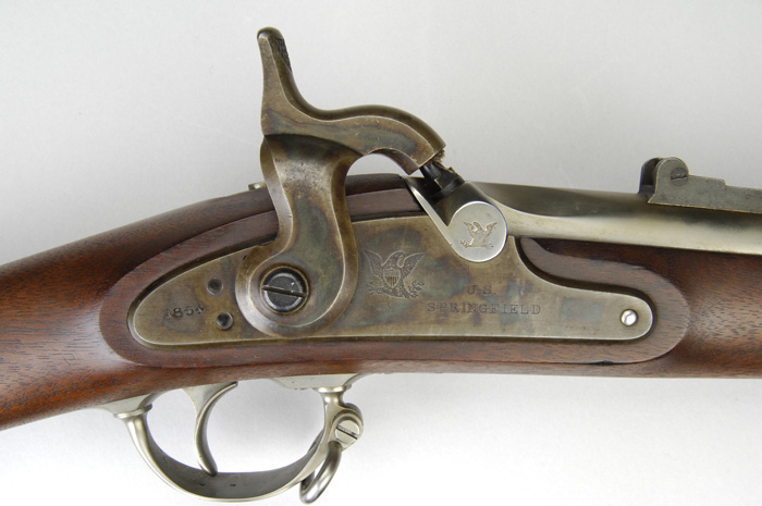 SPRINGFIELD MODEL 1863 RIFLE. Cal. 58, NSN. 40” part oct. bbl. Standard markings on lock and bbl. Dated 1864 on lock and bbl. A large dot follows the standard “V / P / eagle head” proofmark on bbl. The “RPB” cartouche on stock also has a large dot following it. CONDITION: Near new with brilliant casehardening on lockplate and hammer. Arsenal bright finish on all other metal parts. Wood has sharp edges with few handling marks. Mechanically excellent. 4-30821 FS21 (3,000-6,000)