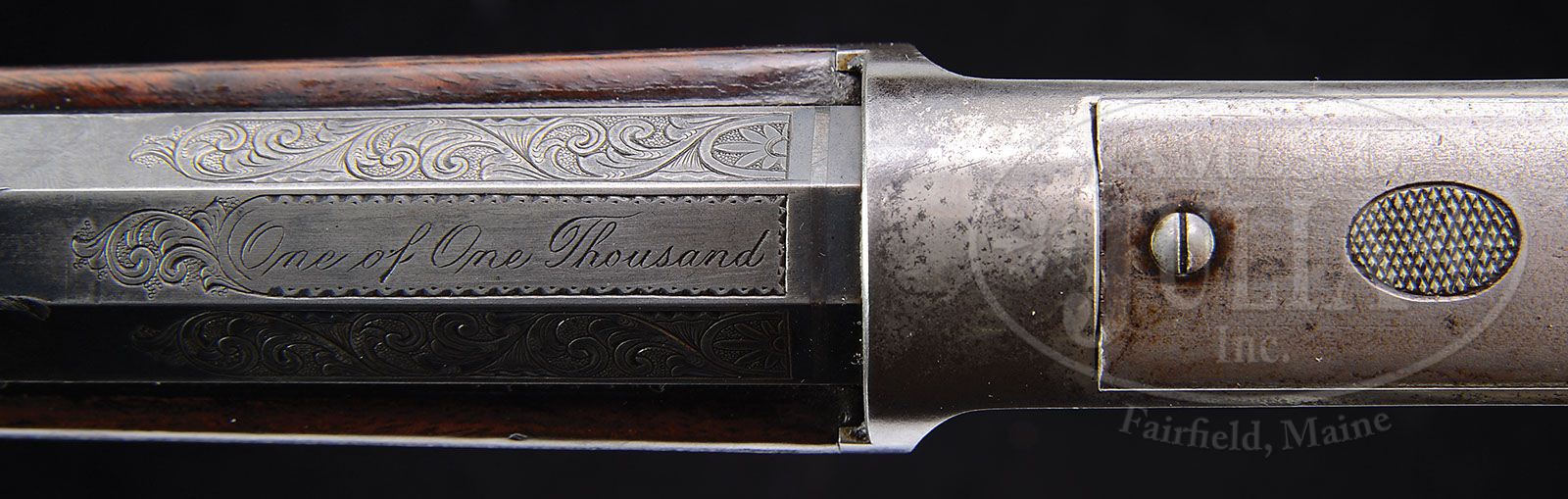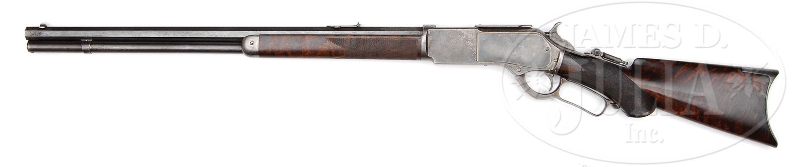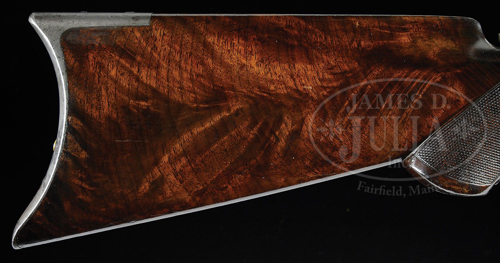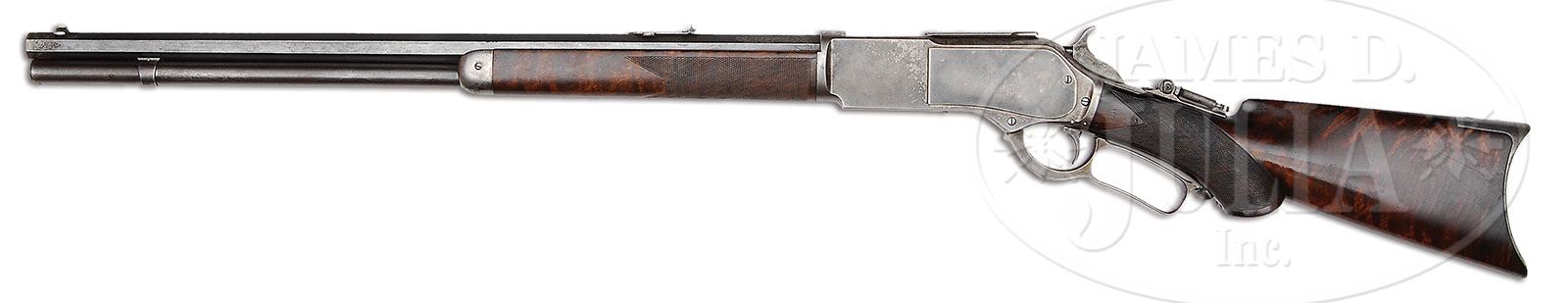 Correction: Condition should read: Very Fine Conditin. The last two digits of the SN (14) appear inside each sideplate. Additionally, the assembly #948 appears on the right side of the lever inside the action. EXTRAORDINARILY RARE WINCHESTER MODEL 1876 1 OF 1000 DELUXE LEVER ACTION RIFLE. SN 10014. Cal 45-60. Wonderful early rifle with 24-3/8″ oct bbl, full magazine, half nickel front sight, 3 leaf platinum line express rear sight and very early Lyman combination tang sight with spiral knurled barrel. Receiver is second type with screw-attached dust cover rail and impressed thumb print dust cover. It is mounted with very highly figured, 2-3X, flame, and shell grain American walnut that has early style checkered forearm and pistol grip stock with convex, fleur-de-lis insert grip cap and crescent butt plate with trap and has single set trigger. Left side of lower tang, under the wood is marked with the assembly number “948” and “XX”. Matching assembly number is also found in top tang channel of butt stock and inside toe of butt plate. Bbl is engraved with foliate arabesque patterns over the chamber area and the engraved panel in period script “One of One Thousand”. Matching engraving is also on 7 of the 8 flats around the muzzle with a silver inlaid band over the chamber area and at the muzzle. Accompanied by an extremely rare, orig, Winchester leather carrying case made of heavy saddle leather, about 45-1/2″ long and form fitted to this rifle, with carrying handle and double end flaps with a black enameled buckle on its billet that also has a staple for locking the billet. Bottom of the case is mounted with brass D-rings for a shoulder strap. Bottom of a sliding part of the handle is marked “WINCHESTER / REPEATING ARMS CO. / NEW-YORK”. According to consignor this case was with the rifle when it was originally found. Inside the end flap is marked with the rifle’s matching SN. According to the book The Story of the WINCHESTER 1 of 1000 and 1 of 100 rifles, Lewis, there were only 55 models 1876 produced as 1 of 1000 rifles during the period 1876-1880, of which only 22 were in cal 45-60. By way of comparing the relative rarity of the model 1876 1 of 1000 rifles there were 132 model 1873 1 of 1000 rifles produced during 1875-1893. According to a chart on page 89 of the referenced publication, this rifle was received in the warehouse June 7, 1880 and shipped the next day to order number 20253, which included 12 other model 1876 1 of 1000 rifles. This rifle is listed as having a 24″ bbl with case hardened finish, checkered pistol grip stock, set trigger and cal 45-60. According to the referenced publication order number 20253 for these 13 rifles was shipped to Winchesters representative John Skinker of San Francisco. It is apparent that sales of these rather expensive rifles were not going well and Winchester was cleaning out the warehouse, probably at a deeply discounted price. Two rifles of that shipment were returned, one for a bbl change and the other for a cal change. This rifle and its leather case are pictured in full color on pages 106 and 107 of the reference publication. The leather carrying case is also pictured on page 157 of the referenced publication and the rifle is again pictured in full color on pages 168-169. The chart on page 89 lists 51 of the 55 models 1 to 1000, only 2 of which are listed with 24″ bbls, with the other being #10031. A copy of the deluxe slip cover edition of the referenced publication accompanies this rifle. It is also accompanied by NRA silver medal and certificate #458, dated April 13, 2007, awarded to this rifle as one of the ten best rifles displayed that year at the NRA meeting in St. Louis. PROVENANCE: Henry F. Wynne & Antecedents; Kenneth Johnson; Kan Chew Collection; Vincent McMahon Collection; Dr. Edmund Lewis Collection. CONDITION: Fine, all matching. Bbl retains 88-90% strong orig blue with a few light nicks and sharp edge wear. Magazine tube has a couple of small dings around the band near the muzzle and retains about 80-85% orig blue, turning a little plum on the outer radius. Forend cap retains traces of case colors, being mostly turned to silver. Receiver retains silvered case colors turning to gray with smoky case colors in the most sheltered areas. Lever and hammer retain faded case covers on the sides, turned silver on the outer faces of the lever. Butt plate is a gray patina. Stock has a hairline by the top tang and another in the front bottom of the forearm, otherwise wood is sound with a few light nicks and scratches, showing moderate wear on the checkering and retains about 90% orig varnish on the butt stock and about 50% varnish on the forearm with the balance a hand worn patina. Mechanics are fine. Strong bore, frosty in the grooves. Leather case is lightly flexed with some surface crackling over the butt stock area with light loss of finish on the handle and overall retains about 75% orig brown finish and has a partially open seam in the butt stock area. 4-48260 JR379 (250,000-300,000)