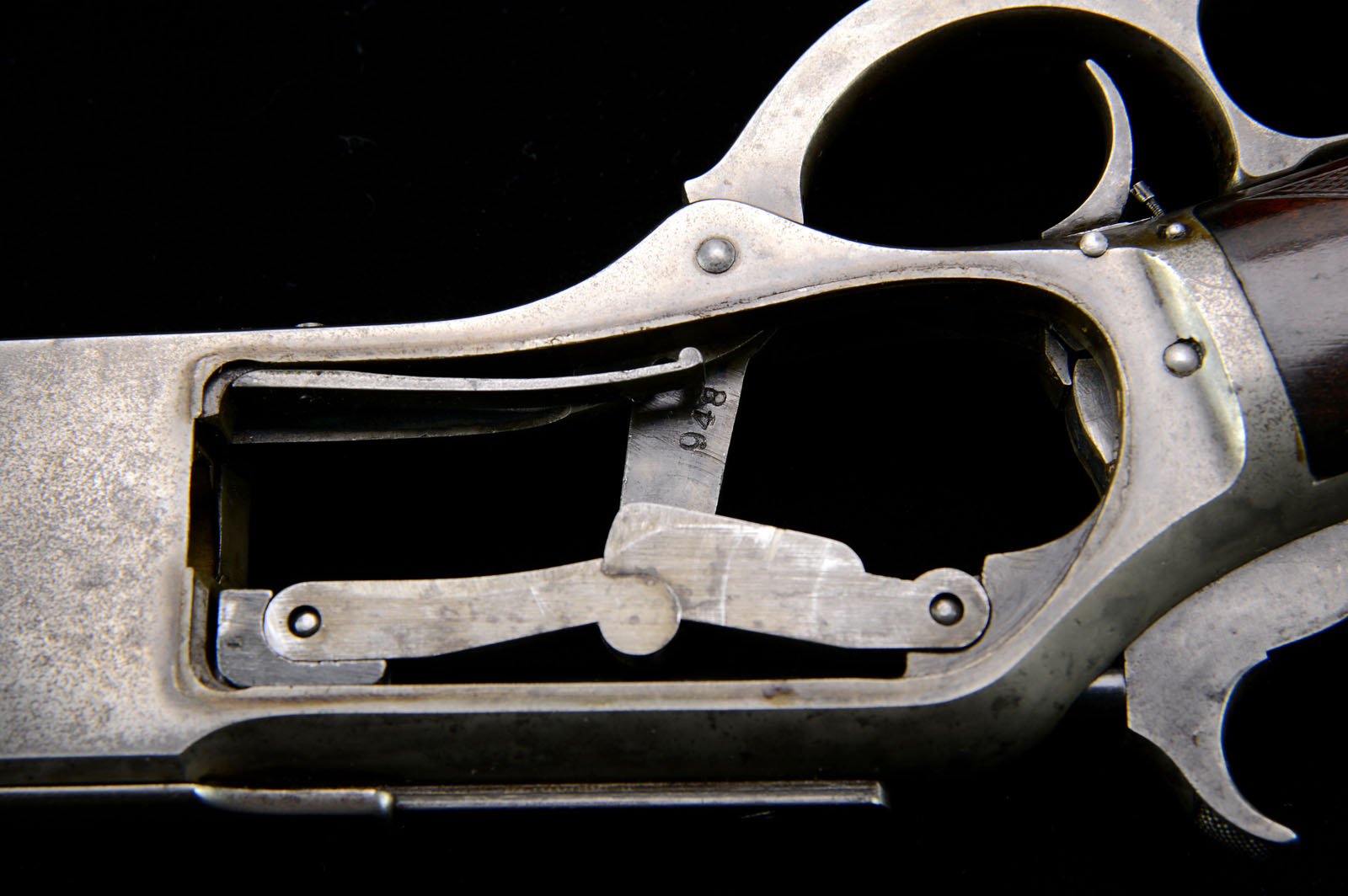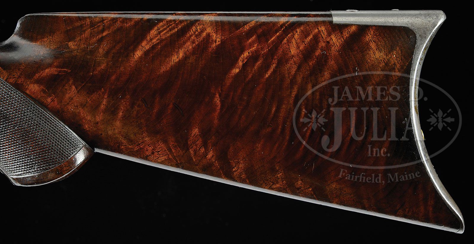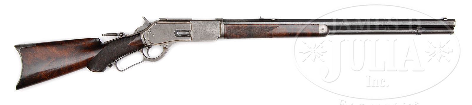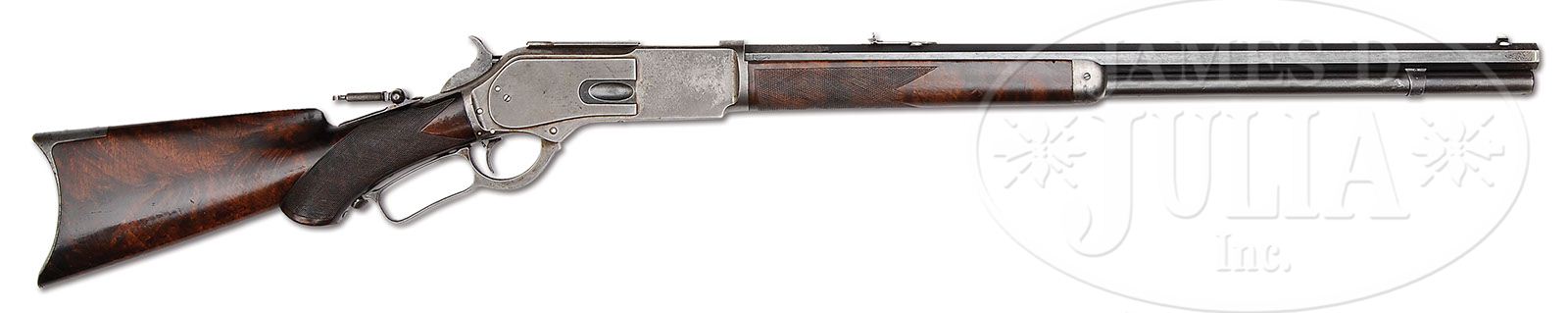 Correction: Condition should read: Very Fine Conditin. The last two digits of the SN (14) appear inside each sideplate. Additionally, the assembly #948 appears on the right side of the lever inside the action. EXTRAORDINARILY RARE WINCHESTER MODEL 1876 1 OF 1000 DELUXE LEVER ACTION RIFLE. SN 10014. Cal 45-60. Wonderful early rifle with 24-3/8″ oct bbl, full magazine, half nickel front sight, 3 leaf platinum line express rear sight and very early Lyman combination tang sight with spiral knurled barrel. Receiver is second type with screw-attached dust cover rail and impressed thumb print dust cover. It is mounted with very highly figured, 2-3X, flame, and shell grain American walnut that has early style checkered forearm and pistol grip stock with convex, fleur-de-lis insert grip cap and crescent butt plate with trap and has single set trigger. Left side of lower tang, under the wood is marked with the assembly number “948” and “XX”. Matching assembly number is also found in top tang channel of butt stock and inside toe of butt plate. Bbl is engraved with foliate arabesque patterns over the chamber area and the engraved panel in period script “One of One Thousand”. Matching engraving is also on 7 of the 8 flats around the muzzle with a silver inlaid band over the chamber area and at the muzzle. Accompanied by an extremely rare, orig, Winchester leather carrying case made of heavy saddle leather, about 45-1/2″ long and form fitted to this rifle, with carrying handle and double end flaps with a black enameled buckle on its billet that also has a staple for locking the billet. Bottom of the case is mounted with brass D-rings for a shoulder strap. Bottom of a sliding part of the handle is marked “WINCHESTER / REPEATING ARMS CO. / NEW-YORK”. According to consignor this case was with the rifle when it was originally found. Inside the end flap is marked with the rifle’s matching SN. According to the book The Story of the WINCHESTER 1 of 1000 and 1 of 100 rifles, Lewis, there were only 55 models 1876 produced as 1 of 1000 rifles during the period 1876-1880, of which only 22 were in cal 45-60. By way of comparing the relative rarity of the model 1876 1 of 1000 rifles there were 132 model 1873 1 of 1000 rifles produced during 1875-1893. According to a chart on page 89 of the referenced publication, this rifle was received in the warehouse June 7, 1880 and shipped the next day to order number 20253, which included 12 other model 1876 1 of 1000 rifles. This rifle is listed as having a 24″ bbl with case hardened finish, checkered pistol grip stock, set trigger and cal 45-60. According to the referenced publication order number 20253 for these 13 rifles was shipped to Winchesters representative John Skinker of San Francisco. It is apparent that sales of these rather expensive rifles were not going well and Winchester was cleaning out the warehouse, probably at a deeply discounted price. Two rifles of that shipment were returned, one for a bbl change and the other for a cal change. This rifle and its leather case are pictured in full color on pages 106 and 107 of the reference publication. The leather carrying case is also pictured on page 157 of the referenced publication and the rifle is again pictured in full color on pages 168-169. The chart on page 89 lists 51 of the 55 models 1 to 1000, only 2 of which are listed with 24″ bbls, with the other being #10031. A copy of the deluxe slip cover edition of the referenced publication accompanies this rifle. It is also accompanied by NRA silver medal and certificate #458, dated April 13, 2007, awarded to this rifle as one of the ten best rifles displayed that year at the NRA meeting in St. Louis. PROVENANCE: Henry F. Wynne & Antecedents; Kenneth Johnson; Kan Chew Collection; Vincent McMahon Collection; Dr. Edmund Lewis Collection. CONDITION: Fine, all matching. Bbl retains 88-90% strong orig blue with a few light nicks and sharp edge wear. Magazine tube has a couple of small dings around the band near the muzzle and retains about 80-85% orig blue, turning a little plum on the outer radius. Forend cap retains traces of case colors, being mostly turned to silver. Receiver retains silvered case colors turning to gray with smoky case colors in the most sheltered areas. Lever and hammer retain faded case covers on the sides, turned silver on the outer faces of the lever. Butt plate is a gray patina. Stock has a hairline by the top tang and another in the front bottom of the forearm, otherwise wood is sound with a few light nicks and scratches, showing moderate wear on the checkering and retains about 90% orig varnish on the butt stock and about 50% varnish on the forearm with the balance a hand worn patina. Mechanics are fine. Strong bore, frosty in the grooves. Leather case is lightly flexed with some surface crackling over the butt stock area with light loss of finish on the handle and overall retains about 75% orig brown finish and has a partially open seam in the butt stock area. 4-48260 JR379 (250,000-300,000)