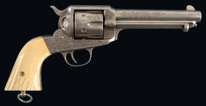 RARE ENGRAVED PRESENTATION TO TOM HORN REMINGTON MODEL 1890 SINGLE ACTION REVOLVER. Cal. 44 WCF (44-40). SN 1254. One of the most rare of Remington revolvers is the 1890, with only 2,020 having been made in period 1891-1896. Of those only a handful were engraved and of that handful of engraved revolvers, few are known with presentations. This revolver has the inscription engraved on left side of bbl at muzzle “PRESENTED TO / TOM HORN / BY HIS FRIEND JOHN COBLE”. Tom Horn was, undoubtedly, one of the best known “guns for hire” to emerge from the dust of the “wild west”. Tom Horn was born in Missouri in 1860 and left the farm at age 14 to go West. He held various occupations including railroad laborer, wagon driver & stagecoach driver. He later became an Army scout and in fact, was one of the men who negotiated the surrender of Geronimo in 1886. He was a rodeo rider and won the world’s championship as a steer wrestler. He subsequently worked as a deputy sheriff in Colorado and a detective for the Pinkerton Agency for four years during which time he claimed to have killed seventeen men. Little is known of Horn in period 1888-1894 after which he appeared in Wyoming and became a range detective hired by the Swan Cattle Company, a consortium of wealthy Wyoming ranchers led by John Coble. He was successful in eliminating many cattle rustlers & thieves from the area north of Cheyenne to Sheridan. In 1898 he joined the cavalry and served with Teddy Roosevelt’s Rough Riders in the Spanish-American War, after which he returned to Wyoming and resumed his rustler killing duties. In 1901 he was accused, tried and convicted for killing a fourteen year old boy, William (Willie) Nickell, which was a mistake as apparently Horn had intended to kill Willie’s father, Kels. Horn was finally executed in January 1903. The orig trial was so controversial, and remains so today, that 100 years later a mock retrial was held in the Laramie County Courthouse and Horn was found innocent. Coble was a close friend of Horn’s and, in fact, edited Horn’s autobiography, Life of Tom Horn: Government Scout and Interpreter – Written by Himself. Apparently this was written while he was in jail awaiting execution. It was published in 1904. Coble also paid for the majority of Horn’s legal defense, the coffin, gravestone and all funeral expenses and publishing costs of his book. It was reported at the time that Mrs. Nickell cursed Coble wishing him to lose everything and die in shame. Subsequent to the execution Coble did lose everything and eventually committed suicide in a hotel lady’s room in Elko, Nevada. Therefore the link between Coble & Horn is solidly established with Coble certainly having had the resources to make a present of such a fine gift. The revolver has a 5-3/4” bbl with German silver front sight and 2-pc smooth ivory grips. It is engraved in L.D. Nimschke style with about 60% coverage fine foliate arabesque pattern engraving on frame with matching patterns on sides of bbl, ejector housing web, backstrap, buttstrap & triggerguard. The cyl has matching engraving on the lands between the flutes and at the back edge. It has a lanyard stud & ring in buttstrap. Accompanied by a copy of the January 1978 Gun Report magazine which contains an article about Remington frontier revolvers by Ron Ogan, where on p. 18 this exact revolver is pictured with the notation that it is from the collection of G.L. Phillips. Also accompanied by internet reprints of Tom Horn’s biography, the family history of Willie Nickell with his killing by Tom Horn and a brief biography of John C. Coble. This exact revolver is pictured on the cover of The Remington Society of America Journal, 2nd Quarter 2006. Additional information regarding Tom Horn can be found in The Legend of Tom Horn: Last of the Badmen, Monaghan, 1946, The Saga of Tom Horn: The Story of a Cattlemen’s War, Karkel, 1954, Tom Horn Blood on the Moon, Carlson, 2001. Provenance: Ex-Ted Bell Collection, Ex-Gary Phillips Collection, who reportedly purchased it from an elderly minister in California. This lot is accompanied by a letter from the consignor outlining the guns recent history together with a contemporary poster for the movie “Tom Horn” depicted by Steve McQueen. CONDITION: Fine plus. No orig finish remains being a cleaned metal color overall with some very fine pitting around muzzle, on ejector housing and face of cyl. Ejector housing has a few light dents & dings. Grips are a wonderful mellow ivory patina with numerous age lines around bottom edges. Will not hold in safety notch, otherwise mechanics are fine, worn lightly pitted bore. Baldwin Collection 4-30010 JR85 (50,000-100,000)