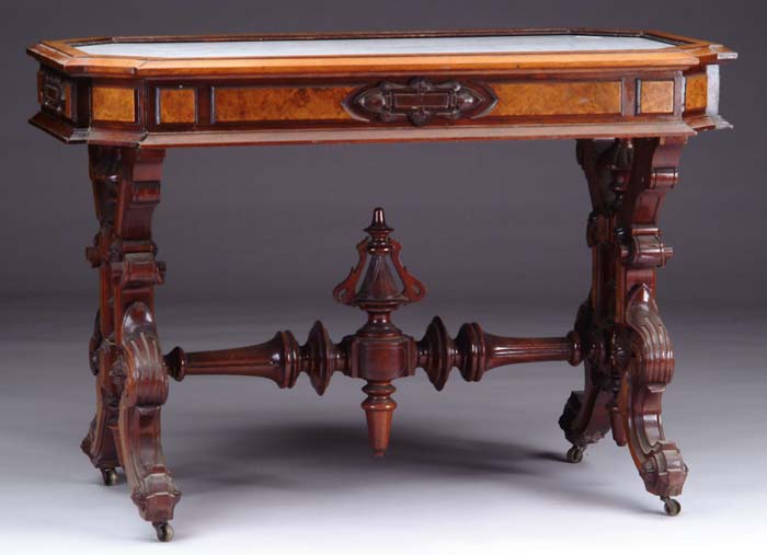 FINE WALNUT MARBLE TOP CENTER TABLE. Nice Burl walnut panels throughout, the top having a inset white marble top, the frieze having one long drawer. The trestle-type base with outstanding turned center stretcher with decorative finial. The ends with center turned posts surrounded by two pierced carved Burl paneled legs ending in brass caster feet. Circa 1865. PROVENANCE: From a fine Millbridge, Maine estate. SIZE: 29-1/2” h x 42” w x 22-1/2” d. CONDITION: Very good. 9-72191 (1,000-1,500)
