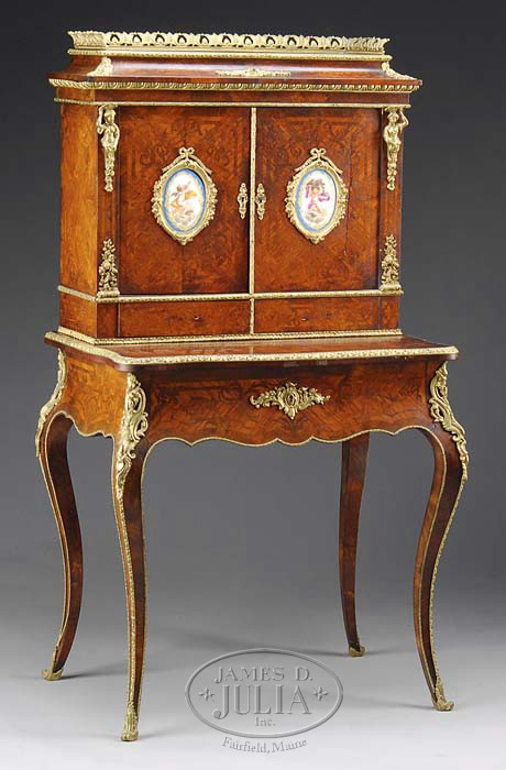 ‘LOUIS XVI’ STYLE PARQUETRY AND GILT-BRONZE MOUNTED BONHEUR DU JOUR, GRADE FT. PARIS. Last quarter 19th century. The rectangular upper case with sarcophagus top, three-quarter cast-brass gallery, and cast floral mounts, above a pair of cupboard doors, each with a painted porcelain plaque within a cast surround, above a pair of aligned drawers stepped back on the table base with concave frieze and scalloped edges, fitted with a long drawer with baise-lined writing slide, the drawer lock engraved “GRADE Ft/Rue de Paix/PARIS”. Raised on tapering, angular, cabriole legs with scrolled feet, the whole inlaid with scrolling vinery on inlaid geometric ground. SIZE: 54″ overall h. x 29″ w. x 19″ d. PROVENANCE: From an extensive private Gulf Coast collection. CONDITION: Retains original surfaces. All mounts original, with very good patina. Small drawer knobs absent. 9-93521 (3,000-5,000)