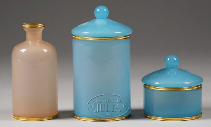 THREE PIECES OF OPALINE GLASS. Three pieces of Italian opaline glass, 1) Blue opaline covered powder jar with original metal base and rim and retains original paper label. 2) Blue opaline covered jar with original metal base and rim and retains original paper label. 3) Pink opaline bottle with original metal base and rim. SIZE: 4″ t to 7-1/4″ t. CONDITION: Very good to excellent. 13-9320 (100-150)