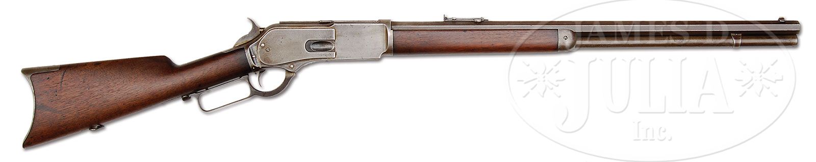 VERY RARE WINCHESTER MODEL 1876 “1 OF 1000” LEVER ACTION RIFLE. SN 4772. Cal. 45-75. Very rare “1 of 1000″ with 24-1/4” oct bbl, full magazine, half nickel front sight and “1876” marked ladder rear sight. Top flat of bbl, in front of receiver, is marked “1 of 1,000”. Receiver is early 2nd type with screwed on dust cover rail and impressed thumb print dust cover and a sgl set trigger. Mounted with uncheckered straight grain American walnut with straight stock and crescent buttplate with trap. Left side of lower tang has the assembly number “49” followed by a faint second assembly number “140” and “XXX”. Assembly #49 is found in top tang channel of buttstock and inside toe of buttplate. Buttstock has factory sling swivel with the corresponding sling swivel in forend cap missing. Accompanied by a packet of correspondence between the then owner, Mr. Alfred H. Wardle, and Mr. T.E. Hall, the Curator of the Winchester Museum. There is also correspondence between Mr. Wardle and George Madis, author of The Winchester Book. Additionally there is correspondence between Mr. Wardle and R.L. Wilson, author of Winchester The Golden Age of American Gunmaking and The Winchester 1 of 1000. Mr. Wardle reports that he discovered this rifle in Norwich, NY in the 1960s and it has remained in his possession until being consigned to this auction. This rifle is pictured on p. 117 of Mr. Wilson’s book listing its history with credit to the Alfred H. Wardle Collection. This rifle is also pictured on p. 244 of the 1985 printing of The Winchester Book and also on p. 101-102 in the newly published book “Winchester 1 of 1000 and 1 of 100 Rifles” by Dr. Ed Lewis. This rifle was received in stock at the Winchester Factory on June 10, 1878 as a “1 of 1,000″ rifle with 26″ oct bbl, full magazine, case hardened receiver, checkered straight fancy stock with set trigger. It was apparently shipped to J. Skinker, the Winchester West Coast representative and returned by him in May of 1881 for re-work. The orig bbl was replaced with the currently installed 24” octagonal bbl and restocked with standard wood and factory sling & swivels. It was then returned to stock and shipped again on Nov. 14, 1882. According to Mr. Wilson’s “1 of 1000” book, in the chart on p. 110, there were only two 1876 “1 of 1000″ rifles produced with 24” bbl, the least of all fifty-one “1 of 1000” 1876 rifles produced. This one is also special in that it is not engraved. CONDITION: Good to very good. No orig finish remains with the bbl being a medium to dark plummy brown patina and the magazine tube a light plum patina; receiver is a cleaned gray metal patina and the lever & hammer are dark patina. Wood is sound with a few light nicks & dings and retains most of a lightly sanded oil finish. Mechanics are fine, strong bore, dark & lightly pitted in the grooves. 4-46160 (50,000-70,000)