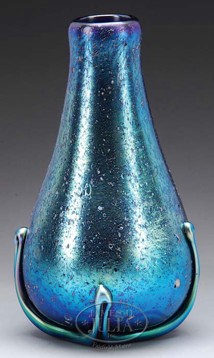 BLUE IRIDESCENT ART GLASS VASE. Very interesting art glass vase is blown in cobalt blue glass with a blue iridescent Cypriot-like textured exterior. The vase has an applied free-form foot with four fingers extending up onto the body of the vase. The vase is signed on the bottom “L.C. Tiffany-Favrile” but we do not believe it to be Tiffany and do not guarantee it. SIZE: 7-3/4″ h. CONDITION: Very good to excellent. 13-9359 (100-200)