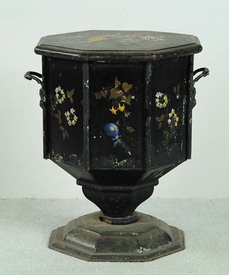 PAINTED FRENCH TOLE FLOOR COAL HOD. 19th Century. Eight sided bin with tapered post ending in domed base. Large cast handles, flower decoration, lift lid with original lift out insert. SIZE: 23” h x 17-1/2” dia. CONDITION: Some paint loss. Good. 9-96398 (400-600)