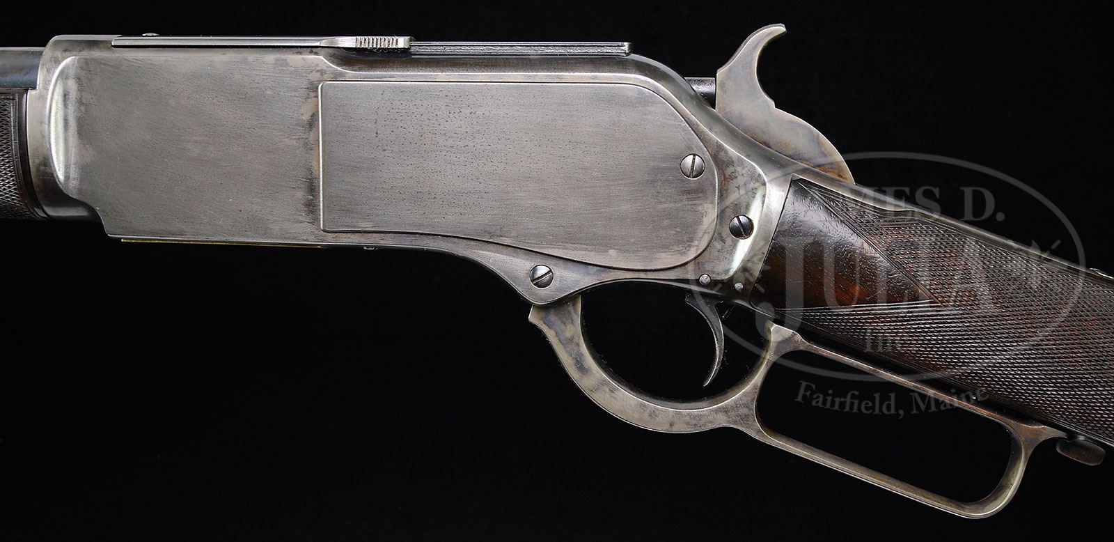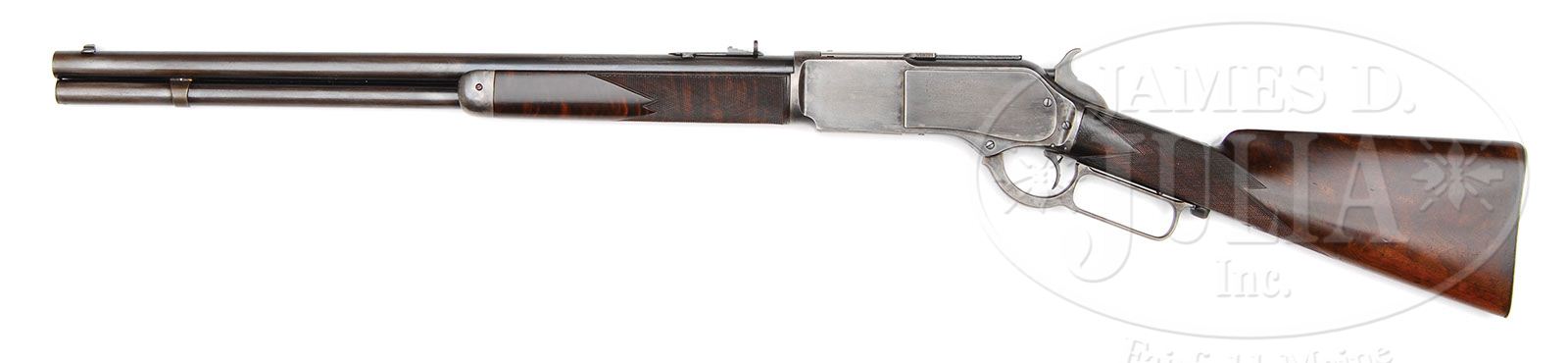 SCARCE DELUXE WINCHESTER MODEL 1876 BIG 50 LEVER ACTION SHORT RIFLE. SN 13854. Cal. 50 Ex. (50-95). Fine deluxe ’76 with rare 22″ rnd bbl, full magazine, half nickel front sight and early style ,short, semi-buckhorn rear sight with checkered edges. Forearm is 8-3/8″ long vs. the standard 9-3/8″. Receiver is 2nd Model with screwed-on dust cover rail and dust cover that is marked “WINCHESTER EXPRESS / 50 CAL. 95 GRS”. Bottom of carrier is marked “50-95”. Receiver has sgl set trigger. Mounted with about 2X fancy grain American walnut with early style checkered forearm and straight stock with smooth steel shotgun buttplate. Left side of lower tang, under the wood, is marked with assembly number “104” along with “XX”, “S” and “EX”. Matching assembly number is also found in the top tang channel of the buttstock. Inside toe of the buttplate has the assembly number “31”. Stock has an old repaired crack through the wrist with two pins in the checkering from the right side. Accompanied by a Cody Firearms Museum letter which identifies this rifle in caliber 50 Express with 22″ rnd bbl, set trigger, checkered stock, shotgun butt, case hardened, received in the warehouse March 15,1881 and shipped same day to Order #24475. This rifle is somewhat unusual with its factory short bbl & short forearm and not being British proofed as the majority of the 1875 Express rifles examined by this cataloger have been British proofed for the India & Africa markets. CONDITION: Fine, all matching except buttplate as noted. Bbl & magazine tube retain strong, bright blue in sheltered areas with the majority a cleaned blue/gray patina; receiver retains a cleaned mottled case colored appearance that has had cold blue applied and then cleaned; it retains orig case colors in sheltered areas; metal is smooth & unpitted; lever & hammer retain strong case colors, a great candidate for a Turnbull restoration. Stock has the aforementioned repaired crack, otherwise wood is sound and retains about all of a professionally restored finish. Mechanics are fine, very bright shiny bore. Shows very little use. 4-47709 JR260 (12,500-17,500)