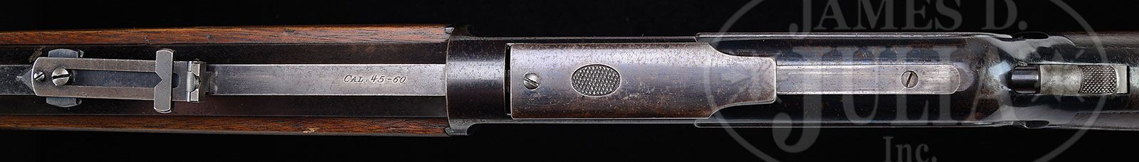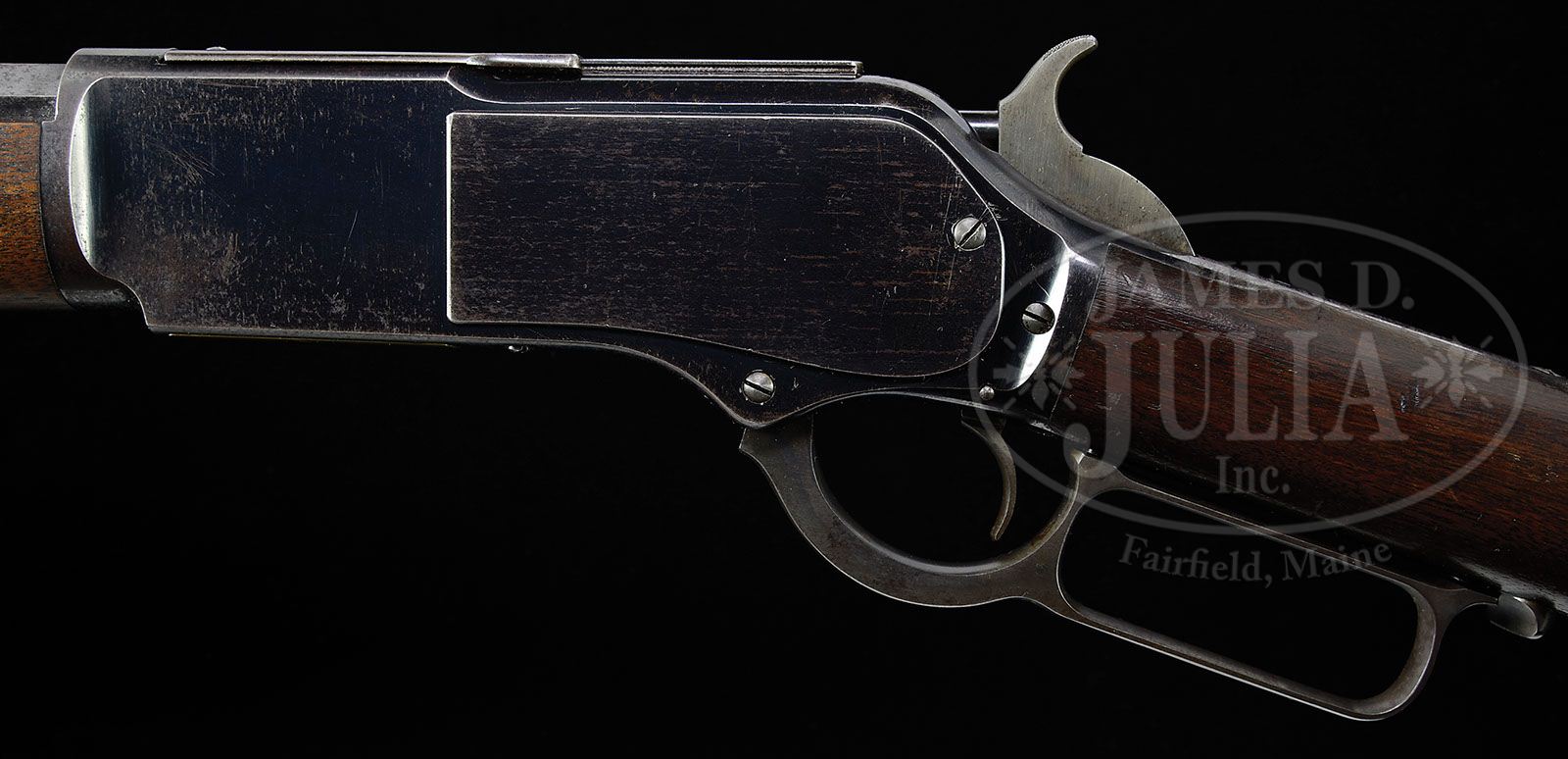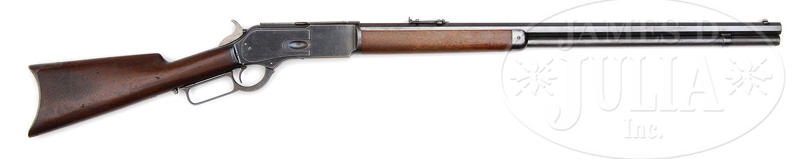 FINE 2ND MODEL WINCHESTER 1876 LEVER ACTION RIFLE. SN 11914. Cal. 45-60. Standard grade rifle with 28″ oct bbl, full magazine, half-nickel front sight and “1876” marked ladder rear sight. Receiver is second type with screwed-on dust cover rail and impressed thumb dust cover. Mounted with uncheckered, straight grain American walnut with straight stock & crescent buttplate with trap. CONDITION: Fine. Bbl and magazine tube retain 93-95% original blue with some light flaking and fine freckling. Receiver retains 92-94% glossy orig blue mixed with fine flaking, showing only light sharp edge wear. Hammer retains smoky case colors and the lever strong case colors in sheltered areas having faded mostly to silver. Mechanics are fine, bright shiny bore. 48140 JR279 (4,000-7,000)