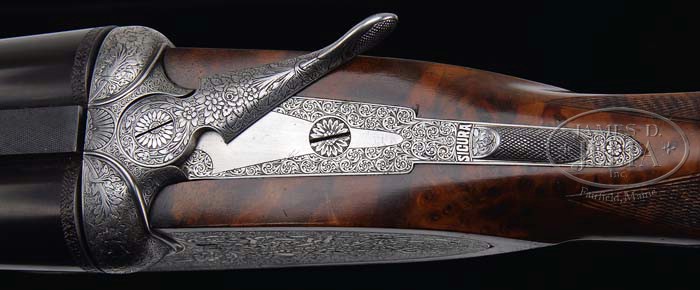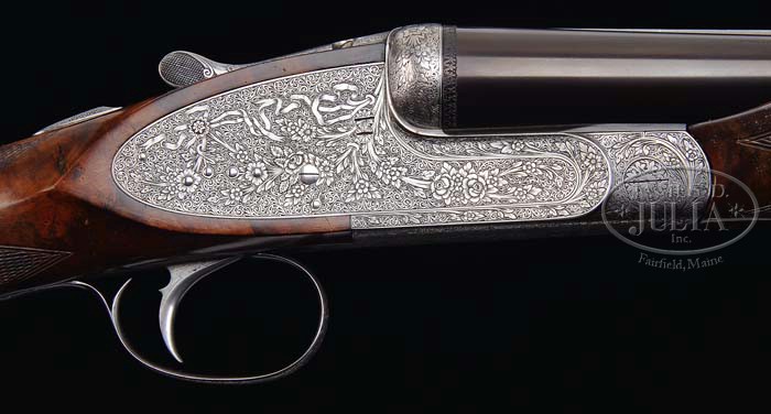 *EXTREMELY RARE FABBRI SIDE BY SIDE PIGEON GUN. SN E361. Cal. 12 ga 28″ Bohler Super Blitz steel barrels. Hand-filed tapered rib with single ivory sighting bead 2 3/4″ chambers IMP-MOD/FULL chokes; ejectors and Fabbri single trigger. Left barrel is marked ARMI FABBRI.BRESCIA/Made in Italy. Right barrel Fabricada Para “D. Juan Purto Belda”. Bottom of right barrel BOHLER.SUPER.BLITZ.STEEL. Barrel flat is date-coded XX7 for 1971. The sidelock receiver is totally engraved with ribbons and flowers and fine foliat arabesque scroll. Bottom receiver has ribbon engraved ARMI FABBRI BRESCIA. Right side of trigger plate is signed F. Iora Inc. Mounted with exhibition quality walnut, fully checkered small beaver tail foreend, push tip release and inlaid gold pigeon on bottom. Checkered pistol grip with right-hand palm swell, ebony grip cap, Monte Carlo and Fabbri black vented recoil pad. Bore diameter: left .726, right .726. Bore restrictions: left .035, right .022. Wall thickness: left .031, right .034. Drop at heel: 1 7/8″, drop at comb: 1 1/4″. Weight: 7 lbs. 7 oz. LOP 14 1/8″. CONDITION: Extremely fine. Barrels retain 99% of their original blue, some tiny handling marks and faint rub on bottom from forend. Receiver is a bright, crisp and clean silver finish. Stock is sound with some tiny bumps and bruises, fine sharp checkering and retains virtually all of its fine hand-rubbed original finish. Forend is sound with good sharp checkering, a few minor bumps and bruises and retains virtually all of its original finish. Mechanics are crisp with non-automatic safety, strong ejectors, bright shiny bores as gun appears to have seen very little use. 4-35280 BDT222 (37,500-47,500)