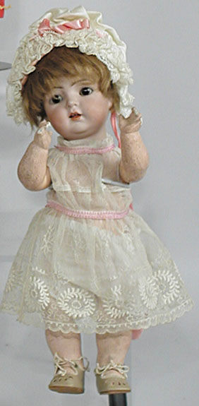 K (STAR) R SIMON & HALBIG BISQUE SOCKET HEAD DOLL. 5 pc. toddler body. Brown sleep eyes, open mouth with two teeth and tongue, light brown straight human hair wig, incised “K (Star) R Simon & Halbig 121”. Redressed. SIZE: 12″ tall. CONDITION: Large chip left knee, otherwise very good. 1-27217 (400-500) Auction: Advertising, Toy & Doll - Fall 2001 Please Note: All prices include the hammer price plus the buyer’s premium, which is paid by the buyer as part of the purchase price. The prices noted here after the auction are considered unofficial and do not become official until after the 46th day. |