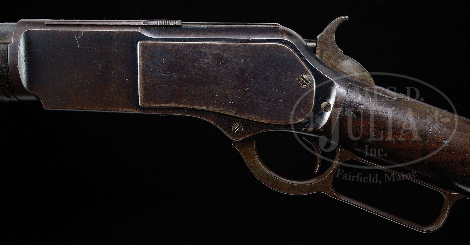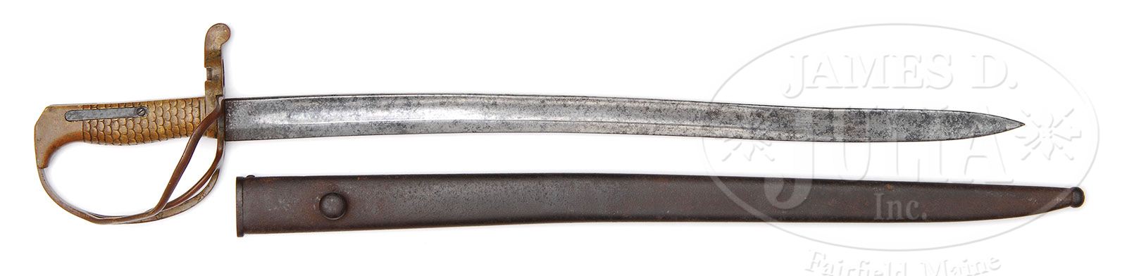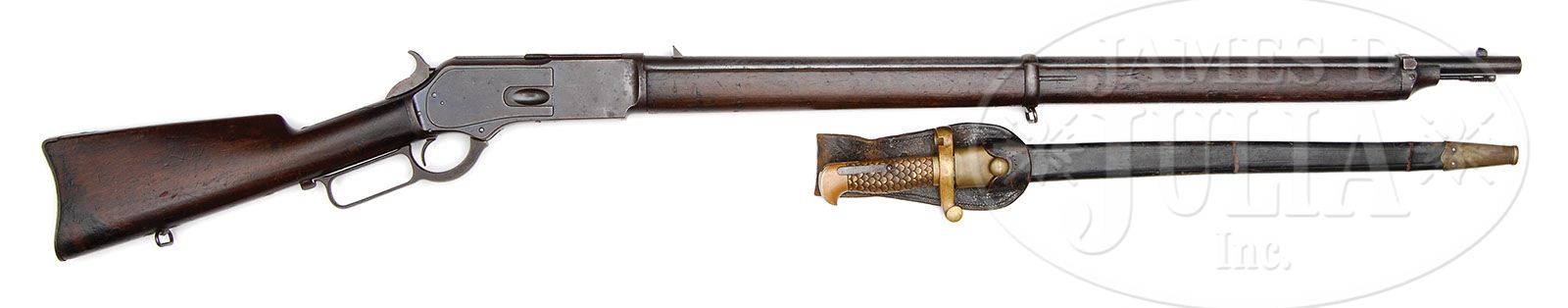 RARE HAWAII CITIZENS’ GUARD THIRD MODEL WINCHESTER MODEL 1876 LEVER ACTION MUSKET WITH TWO BAYONETS. SN 28999. Cal. 45-75. Usual configuration with 32″ rnd bbl, full length forearm with one band and forend cap that has saber bayonet lug on right side, barleycorn front sight/bayonet lug and a replacement fixed rear sight. Left side of forearm has a partially concealed slotted head ramrod. Mounted with uncheckered, straight grain American walnut with straight stock and carbine/musket buttplate without trap. Left side of lower tang, under the wood, is marked with the assembly number “7” and “M”. Matching assembly number is also found in the top tang channel of the buttstock and inside toe of the buttplate. Accompanied by an extraordinarily rare Hawaii Citizens’ Guard sword/bayonet with 20″ Yataghan blade, brass feathered eagle head shaped handle with bbl loop and 3-branch sword-style handguard. This bayonet also has its orig iron scabbard with frog stud. The second bayonet is saber-style with 20″ Yataghan blade that has small proofs on each ricasso, an eagle head shaped feathered brass handle with bbl loop and rnd quillion. This bayonet is accompanied by an orig wood-bodied, black leather covered scabbard with brass tip & throat, brass frog stud and an orig black leather frog. While this musket is not marked with the “CGH” mark of the Citizens’ Guard of Hawaii it is, in fact, an authentic Hawaii Citizens’ Guard musket. This is verified by the accompanying copy of “Report of Citizens’ Guard”. Under the heading “Squad 4” is a listing for what appears to be “F. Mahn” whose residence was “Lihue” and his occupation was “Lima”. It shows that he was issued Winchester 45-75, number 28999, that he was “government”, had 50-rds of ammunition, a belt, was 38 years old and was commissioned Feb. 9, 1895. Additionally accompanying is a copy of a black & white photograph of an Hawaiian Citizens’ Guard officer in dress uniform holding a sword with a stand of three 1876 muskets to his left, one of which is mounted with the sword bayonet as described above and the other two with saber bayonets. Also accompanied by copies of two black & white photographs, one of which is titled “First Co. Sharpshooters / Citizens’ Guard – 1895 / Capt. John Kidwell in Command”. The other shows a group of men, seated & standing, holding a variety of arms. A third photograph shows a city scene of the Hawaii Guard on parade, in uniform, carrying their 1876 muskets. There are other copies of documents from Hawaii. Only a very few of these extremely rare sword bayonets have ever come to light and are almost never encountered on the open market. The regular saber bayonet is also somewhat rare but not nearly so much as the sword bayonet. PROVENANCE: Barnes Family Collection. CONDITION: Very good, all matching. Bbl retains blue in the most sheltered areas being mostly a blue/gray patina; the entire bbl address is legible; receiver & sideplates retain 60-70% orig blue, strong in the most sheltered areas, turning plum elsewhere with scattered rust on right front side; hammer retains strong case colors and the lever traces of case colors being mostly a brown patina. Wood is sound with numerous nicks, dings & scratches and retains a dark hand worn patina. Mechanics are fine, bright shiny bore with one spot of pitting. Sword bayonet is very good with the blade a cleaned, mottled, silver patina with fine pitting; brass handle & handguard retain a dark coffee colored patina; steel scabbard is a dark attic brown with moderate to heavy pitting. Saber bayonet is fine; blade is bright with scattered spots of pitting showing cleaning toward the tip and bright orig polish elsewhere; brass handle and throat & tip retain a dark mustard patina; scabbard has a couple of flexed spots with nicks & scratches and retains strong orig black finish; frog is sound showing heavy wear. 4-47632 JR206 (12,500-17,500)
