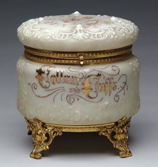 FINE SIGNED WAVE CREST COLLARS AND CUFFS BOX. The round hinged covered box set on four brass feet. The top decorated with hand painted flowers and the body “Collars and Cuffs” and flower spray. In a light milk glass color. Fully signed on bottom with the Wave Crest trademark. PROVENANCE: A Central New York estate. SIZE: 7-3/4” h x 7” dia. CONDITION: Very good. 9-72143 (400-800)