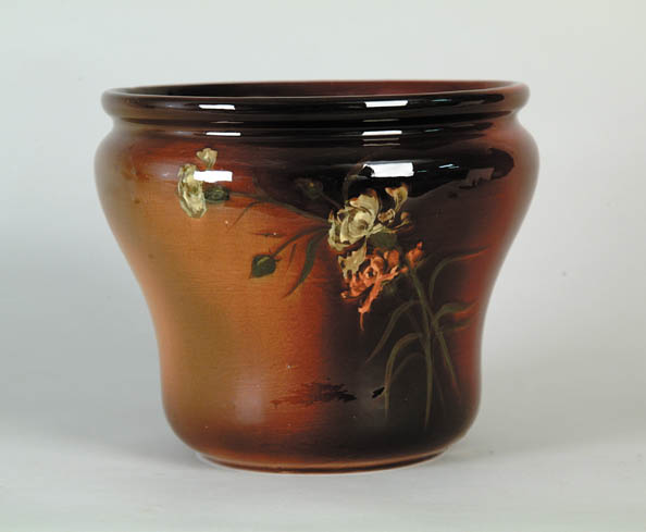 WELLER LOUWELSA HIGH GLAZE JARDINIERE. Artist signed GILL. Impressed mark to base with 223 over 2. Decoration is of two color iris type flowers on a round yellow and green background. SIZE: 8-1/2” h x 9-3/4” dia. CONDITION: Very good. 9-94190 (500-800)