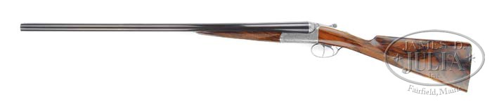 *EARLY CASED DAKOTA ARMS LEGEND SIDE BY SIDE 12 GA TWO BARREL SET. SN DL12007. Cal. 12 ga. 28-1/8″ bbls, tapered concave ribs. Bbl set 1) 2-3/4″ chambers, FULL/FULL choke, w/ejectors. Top rib is marked “DAKOTA ARMS STURGIS S.D. U.S.A.” with gold “#1″ at breech end. Bbl set 2) 3” chambers, IMP-CYL/MOD choke,w/ejectors, similarly marked as set 1 with a gold “#2” at breech end. Both bbls are dated coded “BN” for 2000. Gun is fitted with a unique “Combination” trigger mechanism allowing the front trigger to fire right then left bbls sequentially or right singularly. The back trigger controls the left bbl only. The rnd body receiver is full coverage engraved with fine foliate scroll with shaded background and banner with “Dakota Arms” across each side and an oval with a single feather center of bottom. Signed on right side of trigger guard “ABig”. Mounted with highly figured marblecake walnut, checkered splinter forend for each bbl with push tip release, checkered straight grip stock, checkered butt with engraved heel & toe plates, and blank gold oval. Bbl 1) Bore diameter: left -.729, right -.729. Bore restrictions: left -.043, right -.042. Wall thickness: left -.033, right -.034. Drop at heel: 2-3/8″, drop at comb: 1-7/16″. Weight: 6lbs. 11oz. LOP 15″. Bbl 2) Bore diameter: left -.731, right -.731. Bore restrictions: left -.016, right -.004. Wall thickness: left -.035, right -.032. Drop at heel: 2-1/4″, drop at comb: 1-7/16″. Weight: 6lbs. 10oz. LOP 15″. Accompanied with oak and leather case with brass corners, burgundy felt interior and “Dakota American Legend” on inside lid. Factory records confirm seventh Legend ordered.The Legend shotgun is the first original design to be developed in the U.S. in over 70 years. It gun of style, grace, and exquisite balance. CONDITION: Extremely fine, appears to be test fired only. Bbls retain virtually all of their fine orig blue with a few minor handling marks and faint rub mark on bottom from forend. Receiver is sharp and clean and retains virtually all of its silver finish. Stock is sound with sharp crisp dry checkering and only a few tiny handling marks and retains all of its fine factory orig finish. Forends are sound with dry crisp checkering, some tiny handling marks and retains virtually all of their fine orig factory finish. Case is in equally new condition with just a few minor scuffs in the leather. 4-37404 BDT217 (15,000-20,000)