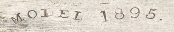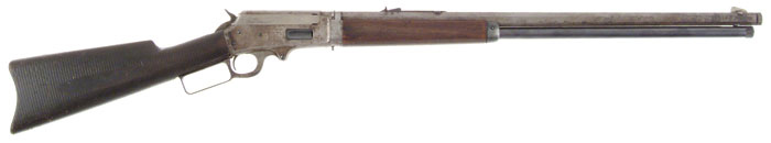 PROTOTYPE MARLIN MODEL 1895 TAKEDOWN LEVER ACTION RIFLE. Cal. appears to be 45-70. NSN. Believed to be a tool room model gun. Still in the white, unpolished with rough machine marks. This rifle has a 26″ oct bbl with an additional 3/8″ untrimmed muzzle. It has a full magazine with German silver blade Rocky Mountain front sight and an altered semi-buckhorn rear sight. It appears that the sights were added later. It has the Marlin swinging lever takedown system. Left side of receiver has a 5/16″ “cut-away” at the left lower front where one can observe that the magazine follower is withdrawn for tekedown, and there is a curious notch at the left top front of the receiver. It has a rough turned buttstock with straight grip and smooth steel, semi-crescent buttplate. Forearm is oversized but finished. The top left front of receiver is hand stamped “1st / 95 / TAKE / DOWN” and there is an “M” below that. Left side of receiver also has faint, old, hand-lettered ink marking “Model”. Bolt is hand stamped “Model 1895”. CONDITION: As noted, still in the white with rough machine marks and some scattered rust spots & patina. Magazine tube and forend cap are finished products, and retain about all of their orig blue. Buttstock is a dark oil stained patina and the forearm retains most of its varnish finish. Mechanics are fine. Brilliant shiny bore. 4-58864 JR233 (4,000-6,000)