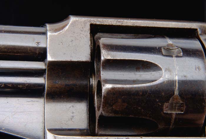 RARE REMINGTON MODEL 1875 EGYPTIAN CONTRACT SINGLE ACTION REVOLVER. Cal. 44 Remington CF. SN 635. Believed to be the finest Egyptian Contract 1875 extant, this revolver has blued finish with 7-1/2″ rnd bbl, pinched post front sight, blued iron triggerguard and 2-pc walnut grips with a lanyard loop in the butt. Both grips have matching penciled serial numbers inside. The left side of the frame by the bbl is stamped with an “R” and it has a corresponding small star on the bbl and a matching “R” on cyl. These marks signify Egyptian contract. This rare revolver is one of the 10,000 pieces contracted from Remington in 1875 which, to date, only a few have been discovered. This is, reportedly, the finest condition Egyptian Contract Model 1875 Remington extant. CONDITION: Very fine, the bbl retains 93-95% strong bright orig blue with light muzzle wear, slightly thinned along the sides of the bbl. The ejector rod housing and web retain 95-96% glossy bright blue. The frame has bright blue in sheltered areas with the balance having flaked to a medium dark patina. There is some fine pitting near the forcing cone area on the top strap. The grip frame is mostly a blue/gray patina and the grips have light handling and use marks and retain most of their orig bright varnish. The safety notch on the hammer is missing, otherwise the mechanics are crisp, bright shiny bore. Baldwin Collection 4-30014 (11,000-16,000)