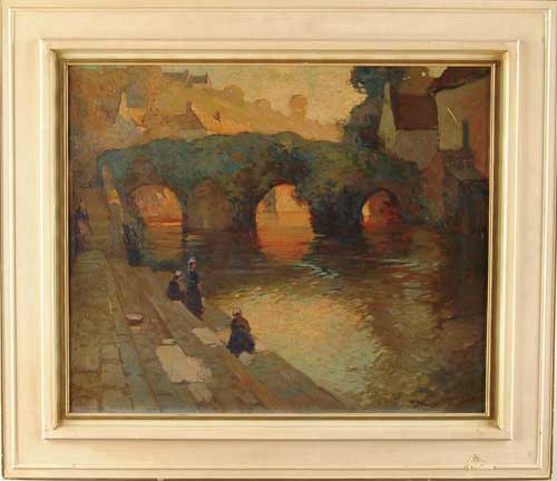 GEORGE AMES ALDRICH (American, 1872-1941) “THE FLOWERED BRIDGE, QUIMPERLE”. Oil on board scene shows a three arch stone bridge covered with greenery. Houses are seen on hill beyond and beside. Four ladies are seen on steps, one is washing clothes. Nice reflections of a late afternoon sky in the water. Signed lower right “G. Ames Aldrich”. Housed in a painted wood frame with a Gump’s San Francisco, Honolulu label. Title on back of board. SIZE: 20” x 24”. CONDITION: Appears to have a scratch in right corner building. Very good. 9-98640 (10,000-15,000)