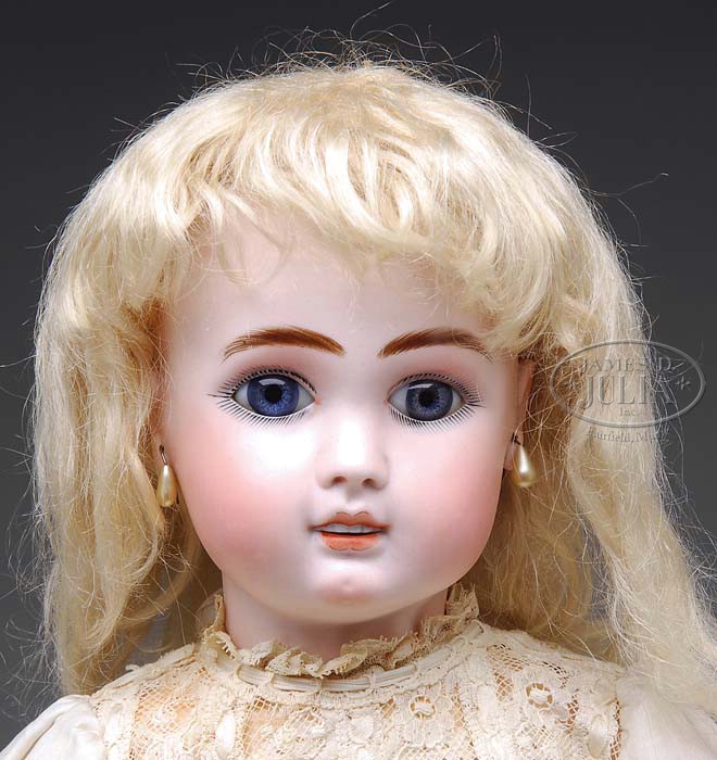 Fre A 15 STEINER BEBE. Nicely colored bisque enhanced by blue paperweight eyes and a fanciful French Bebe silk and lace drop waisted dress. This young lady is on a composition clockwork walker body with mama papa bellows. Body is rubber stamped “Le Petit Parisien” indicating she is a walking model with special underpants to make the walking process easier. Ex-Mildred Seeley collection. SIZE: 24″ t. CONDITION: Overall very fine plus, some minor body touch up. 1-8902 (3,000-4,000)