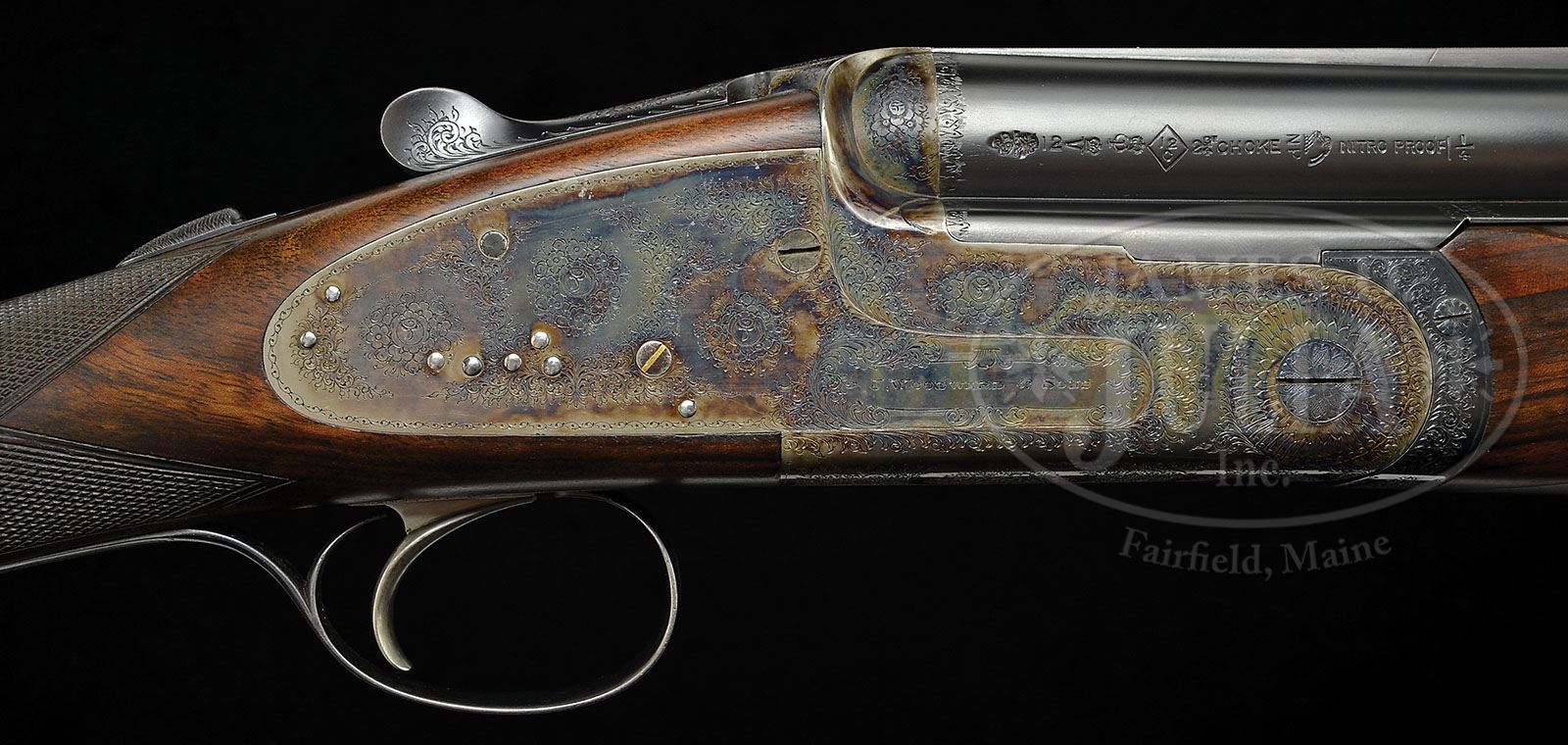 *RARE AND FINE WOODWARD ROUND BODY OVER-UNDER SINGLE TRIGGER HEAVY GAME GUN WITH CASE. SN 7173. Cal. 12 ga. 2-3/4″ Chambers. 29-1/8″ Demi-bloc bbls with solid, file cut rib are engraved “James Woodward & Sons. 29. Bury Street. St. James’s. London. England.” on left side of top bbl. Right side of top bbl and bottom of bottom bbl are stamped with London nitro proofs for 2-3/4″ chambers. Case hardened, round body, low profile, OU action features automatic safety (SAFE inlaid in gold), gold band tumbler end cocking indicators, and non-selective single trigger. Action is engraved with well cut, classic, small, shaded scroll with rose bouquet highlights. “J Woodward & Sons” is in parchment scrolled device at front of each lockplate. Bottom of action is engraved “Woodward’s” and “Under & Over” in arches around recess cut for forend iron, which is engraved “Patent”. SN is on tang of scroll engraved small bowed trigger guard. Fully marbled and lightly figured European walnut straight grip buttstock measures 14-1/2″ over leather faced, thin, red pad. Standard point pattern checkering with mullered borders is at grip. Toe line with gold oval engraved “G.P.” is shaped with about 3/16″ negative camber giving racy swept look. One piece matching ejector forend has Anson release. Bore diameter: top -.729, bottom -.729. Bore restrictions: top -.036 (Full), bottom -.037 (Full). Wall thickness: top-.024, bottom -.025. Drop at heel: 2-1/8″, drop at comb: 1-1/4″. Weight: 7 lbs. 12 oz. LOP: 14-1/2″. Makers oak and leather case with brass corners and leather trimmed canvas outer cover, is embossed with an early owner’s name on rectangular inset leather label on top. Leather is additionally embellished with embossed line borders with fleur-di-lis highlights. Interior is lined in scarlet cloth with gold embossed black leather Woodward label in lid. Case contains pair of A & F marked snap caps, red morocco wallet with cleaning brushes inside, 2-pc rosewood and brass cleaning rod with mop, Turk’s head and jag. There are also an A & F marked square oil bottle, hard rubber striker block, and the key. PROVENANCE: Abercrombie & Fitch hang tags with specifications and known information. CONDITION: Excellent. Bbls retain nearly all of a London quality satin re-blue, engraving slightly washed. Action retains 90 – 95% of its orig bright case hardening color, silvered on sharp edges. Lockplates retain nearly all of their color. Top lever and forend iron show only slight silvering to their orig bright blue. Trigger guard re-blued, and retains essentially all of that blue, engraving still sharp. Stocks retain nearly all of a factory quality oil finish with some light marks and a small scuff in forend checkering. Pad added after making, as cut off piece of buttstock with checkered butt is in case. Bores are excellent, bright and shiny throughout. Action is tight. Bbls are on face. Ejectors are in time. Trigger works, but is a bit sticky (probably needs cleaning). Case leather is very fine with some slight darkening and rubs. Straps and handle are fine. Canvas outer cover has rubs and discoloration, leather trim also rubbed, with some slight tatters. Straps are good. Interior cloth is fine with some areas patched, lightly soiled, and marked by gun and accessories. Accessories are good. By SN, one of the last guns to leave Woodward’s after being taken over by Purdey’s. Records indicate it was delivered in 1949, so was most likely finished by Purdey’s. Round body Woodward O/Us are very rare. This may be one of the finest extant. 4-48362 MGM43 (30,000-50,000)