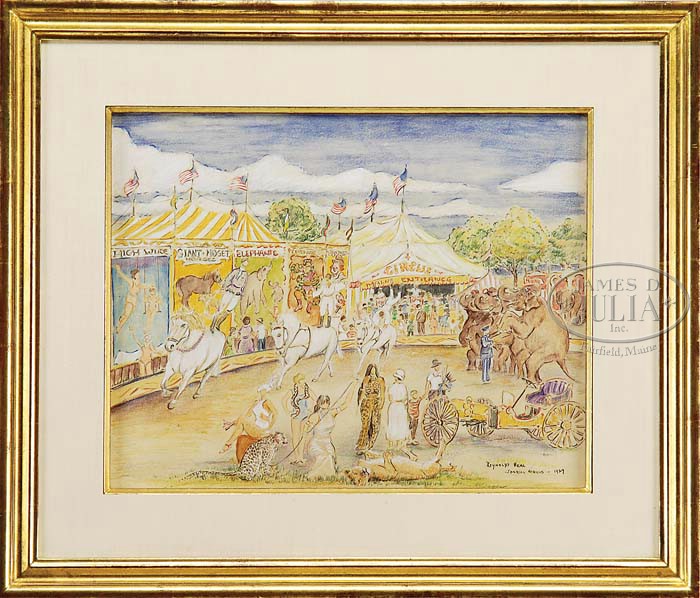 REYNOLDS BEAL (American, 1866-1951) SPARKS CIRCUS, 1929″. Mixed media circus scene shows a round outdoor ring with circus performers including elephant trainer, horse acrobats, lion tamer and others. The background are the giant midway posters and tents flying American flag. Housed in a fabulous modern double frame with glass by Guido Frame Studios. SIZE: Sight: 14-1/2″ x 18-1/2″. CONDITION: Very good. 9-98589 (2,000-3,000)