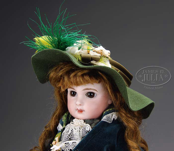 15″ JUMEAU BEBE. Head is incised “Depose E6J” has brown glass paperweight eyes, closed mouth and pierced ears. Body is stamped in blue “Jumeau Medaille D’or Paris” and has separate ball joints at elbows and knees as well as straight wrists. She wears a replaced costume of green taffeta and lace with blue-green velvet jacket, an antique brown mohair wig and wide brimmed felt hat with cloth flowers and feathers. Shoes are camel colored brown leather boots that button on each side. SIZE: 15″ (37cm). CONDITION: Fair. Head is extensively restored. Lower arms and legs repainted. 1-9198 (1,200-1,800) Auction: Advertising, Toy & Doll - Spring 2009 Please Note: All prices include the hammer price plus the buyer’s premium, which is paid by the buyer as part of the purchase price. The prices noted here after the auction are considered unofficial and do not become official until after the 46th day. |