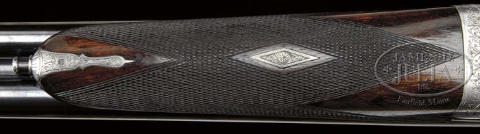 *CLASSIC MANTON & CO BOXLOCK DANGEROUS GAME DOUBLE RIFLE WITH CASE. SN 68797. (ca 1925) Cal. .470 Nitro. 26″ Chopper lump bbls are fitted with file cut quarter rib mounting one standing, 2 folding leaf express sights transitioning to concave mid-rib with longitudinally dovetailed silver bead front sight mounted in shaped and file cut ramp. Tops of bbls are engraved “Manton & Co” and “London and Calcutta”, and stamped “FOR CORDITE” and “.470 3-1/4 CASE”. Bbl flats are stamped with Birmingham nitro proofs for 75 grains cordite and 500 grain bullet. SN is stamped on loop, and large sling eye is soldered to bottom rib. Robust Webley long bar action features pivoting third fastener engaging square shouldered dolls head extension, automatic safety (SAFE inlaid in gold), and brushed strikers. Blued steel trigger guard extends to steel grip cap. All metal parts are engraved with 70% coverage well cut shaded open scroll. “Manton & Co” is on each side of action. SN is on grip. Nicely streaked and flame figured European walnut full pistol grip buttstock measures 14-3/4″ over Silvers type pad, and features drop points, nicely sculpted shadow line right hand cheekpiece, and 18 LPI point pattern checkering with mullered borders. Large sling eye and vacant silver oval are on toe line. Matching splinter forend has Anson release. Drop at heel: Approx. 2-1/2″, drop at comb: Approx. 1-3/4″. Weight: 11 lbs. 0 oz. LOP 14-3/4″. Good quality tan leather case with brown leather stitched corners is lined with burgundy cloth, and contains 2-pc coated steel and brass cleaning rod, round oil bottle, black wallet with brushes and mops, and a pair of snap caps. Also in case is a portion of target showing 2 bullet holes, one in x ring, and one 1-1/4″ below it with notation “470 Manton”. Consignor states that this rifle shoots exceptionally well with Federal factory ammo. CONDITION: Excellent, as partially refinished. Bbls retain nearly all of London quality re-black over one or 2 light pinprick pits that did not polish out. Action retains 50 – 60% orig case hardening color, turning to silver on fences and bottom edges. Floorplate, trigger guard and top lever have nearly all of their correct charcoal re-blue. Engraving remains sharp. Stocks retain nearly all of what appears to be their orig finish but is most likely an old and correct re-finish, with a few minor marks. Correctly re-cut checkering shows some wear. Bores are excellent, shiny with sharp rifling throughout. Action is tight. Right bbl is slightly off face, showing a glimmer of light. Case is very fine with a few minor marks on exterior. Straps are a bit tired. Handle is good. Interior cloth is fine, as are accessories. A nicely balanced fast handling rifle. 4-45058 MGM132 (20,000-25,000)