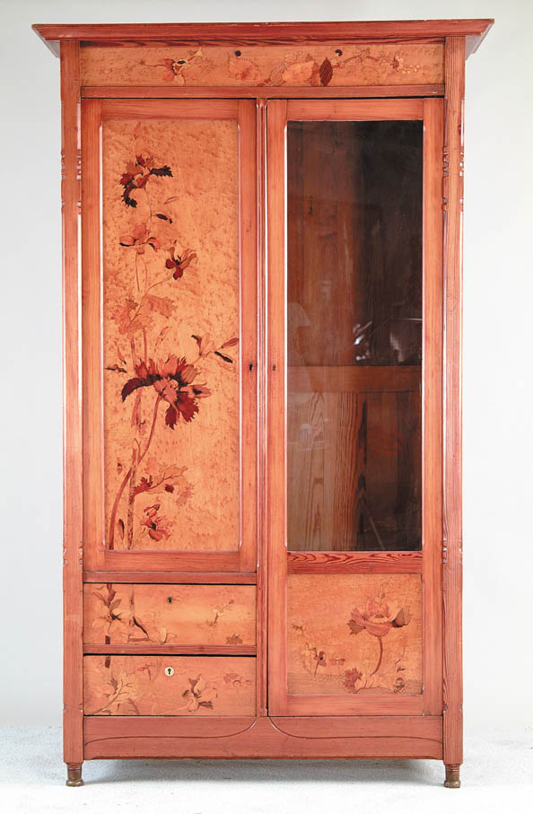 FINE ART NOUVEAU MARQUETRY PINE AND BIRDSEYE MAPLE WARDROBE BY EMILE GALLE. Signed in bottom panel “Galle”. Piece has two doors with divider. Right door has large glass pane with bottom square panel of inlaid flowers and fitted for adjustable shelves which are not present. Right section has large door with large birdseye panel inlaid with large vine of multi-colored wood flowers over two drawers. Each with similar marquetry fronts. All in a pine case on short turned feet. SIZE: 83” h x 43-1/2” case x 18”. CONDITION: Very good. 5-68622 (8,000-12,000)