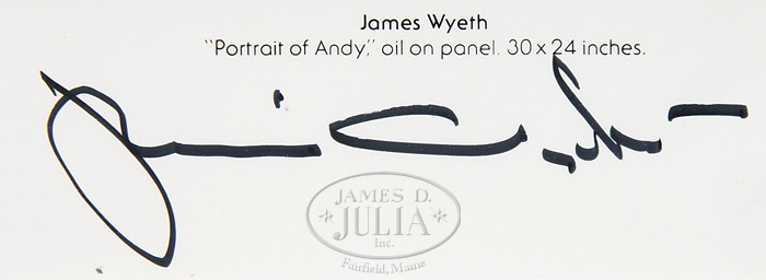 FRAMED AUTOGRAPH: ANDY WARHOL; ARTIST (Russian, 1928-1987) & JAMIE WYETH; ARTIST (American, 1946-). An interesting collage incorporating an Andy Warhol portrait of Jamie Wyeth print which has been signed “Andy Warhol 1976”. To the right is Jamie Wyeth’s print of a portrait of Andy Warhol being penned signed by Jamie. Below which is a print of John Kennedy inscribed “For Elwyn Dearborn, Jamie Wyeth” and the last is a Campbell Soup collage print, pen signed by Andy Warhol. Housed in a brown wood frame with white matte having four cutouts. SIZE: Total: 20-1/2″ x 19″. PROVENANCE: Collection of Elwyn Dearborn, Medford, NJ & Portland, ME. CONDITION: Very good. 9-96108 (1,000-1,500)