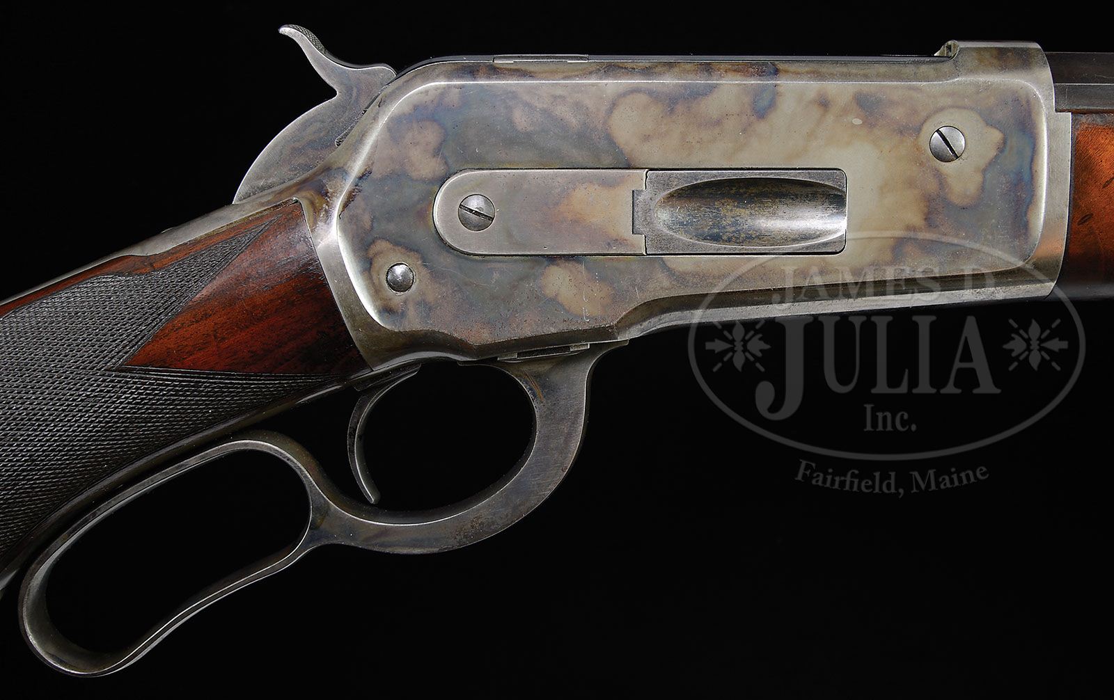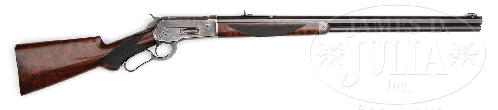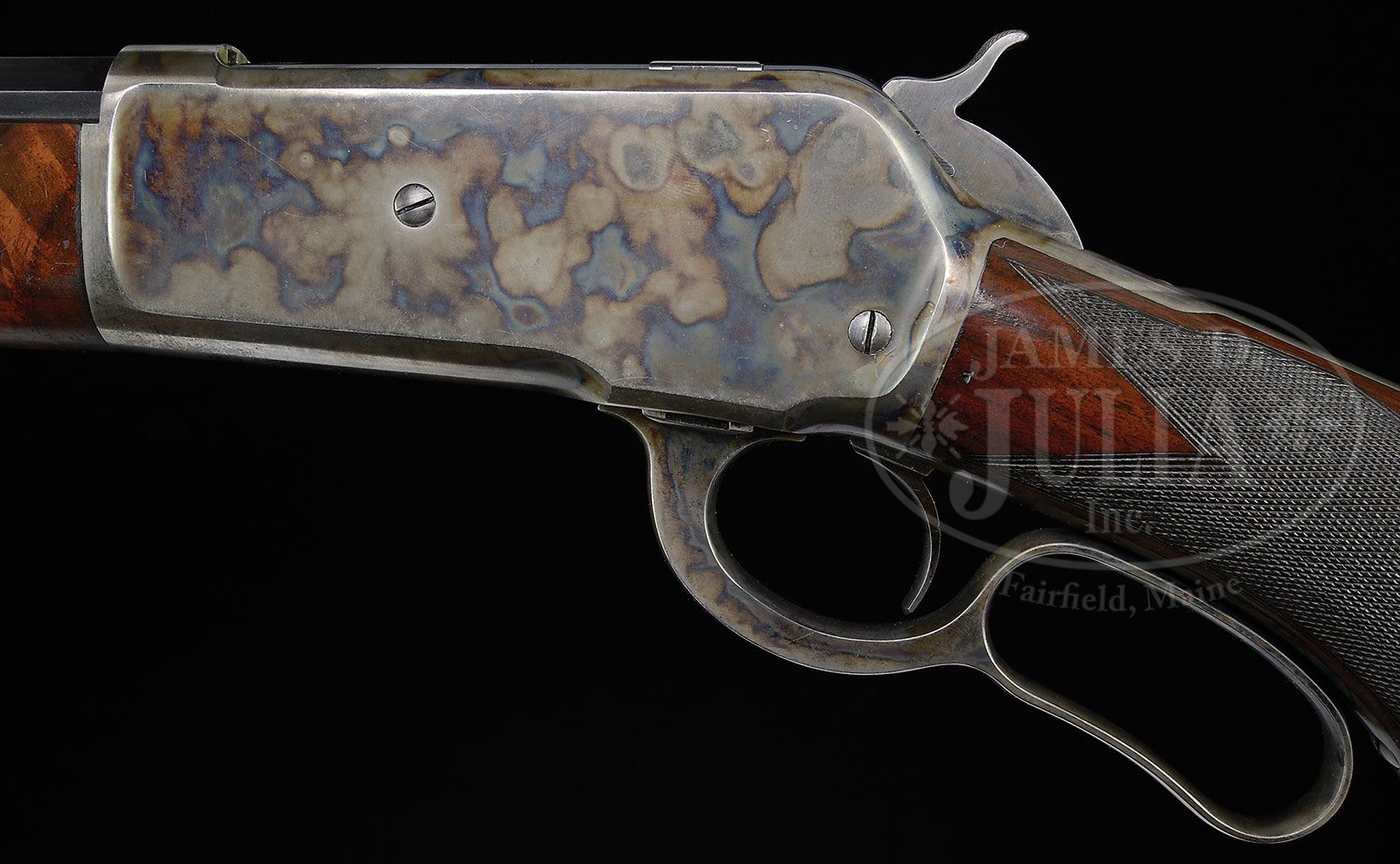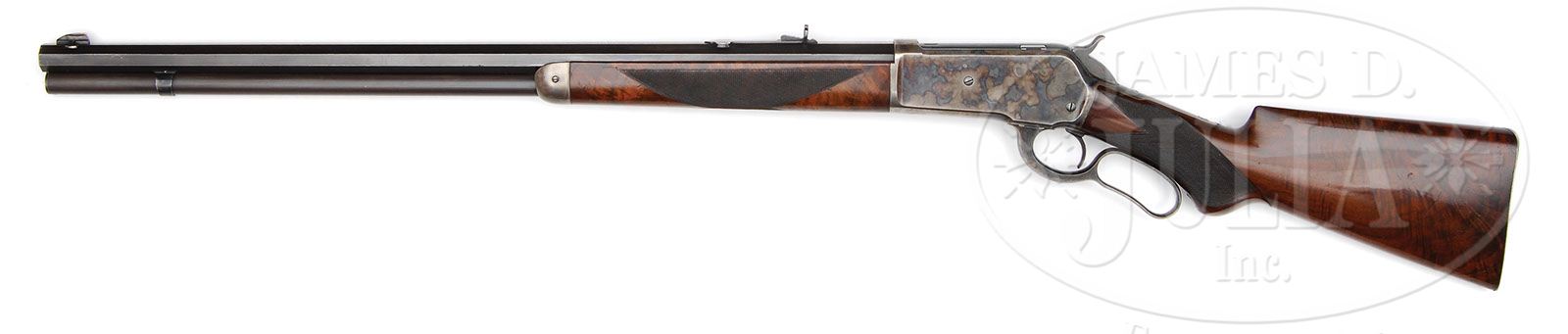 FINE DELUXE WINCHESTER MODEL 1886 LEVER ACTION RIFLE. SN 71226. Cal. 45-90. Fine deluxe ’86 with 26″ oct bbl, full mag, gold bead Sheard front sight and semi-buckhorn rear sight. Mounted with 2-3X, center crotch, flame grain American walnut with H-style checkered forearm and black insert serpentine grip buttstock that has smooth steel shotgun buttplate. Left side lower tang, under the wood, is stamped with the assembly “535”, “S” and “XX”. Matching assembly number is also found inside top tang channel of buttstock and inside toe of buttplate. Accompanied by a Cody Firearms Museum letter which identifies this rifle in cal 45-90 with oct bbl, plain trigger and checkered pistol grip buttstock with shotgun butt, received in the warehouse Nov 1, 1892 and shipped the next day to order number 8514. CONDITION: About very fine, all matching. Bbl retains 90-92% orig blue turning a little plum with sharp edge wear and a few fine, light scratches. Mag tube retains a smooth even plum blue patina with one small ding and a small area of old surface rust. Receiver retains virtually all of its orig case colors, moderately faded on sides at top edge, mostly faded to silver on bottom. Top tang retains moderately to heavily faded colors. Hammer and lever retain most of their orig case colors, moderately faded. Forend cap retains most orig colors mostly faded. Buttplate retains 60-65% thin orig blue. Stock has a chip back of top tang and a few, very minor, very scattered tiny nicks and scratches and retains most of its bright, orig piano varnish finish. Forearm is also sound, showing a little wear at the carry point, with some minor freshening of the checkering and overall retains 85-88% strong orig piano varnish. Mechanics are crisp, bright shiny bore. Rifle shows very little use. 4-47346 JR133 (20,000-30,000)