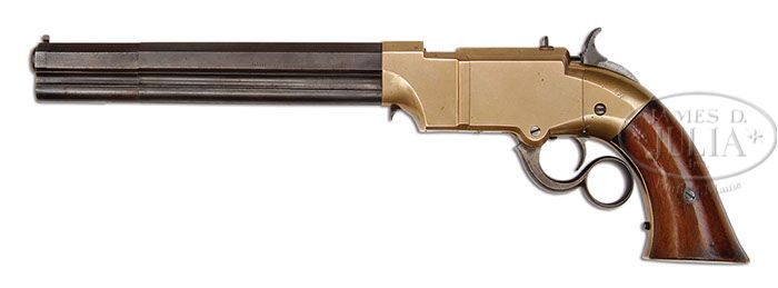 UNIQUE VOLCANIC ARMS NAVY SIZE LEVER ACTION PISTOL WITH ADDRESS ON LEFT SIDE. SN 86. Cal. 38. This is the only Volcanic lever action navy pistol noted with the placement of bbl markings “THE VOLCANIC / REPEATING ARMS CO. / PATENT NEW HAVEN CONN. FEB. 14. 1854″ on the left bbl flat as opposed to all other specimens with maker’s mark on top we are aware of. Other than placement of markings, this gun conforms to standard configuration with 8” oct bbl that has integral magazine tube. Front sight is the orig iron pinched pin with fixed rear sight dovetailed in top flat of frame. Frame is gun metal brass and mounted with 2-pc uncheckered straight grain walnut grips numbered to this pistol. SN was observed on left side of butt strap under grip, on lever, inside both sideplates and on the bolt. This is your opportunity to buy the only Volcanic Navy pistol which can be displayed on its side with maker’s mark visible. CONDITION: This gun is very good to fine overall. Bbl & magazine tube retain traces of orig finish near the frame with the balance a mottled silver/brown patina with fine pinprick pitting. Frame & sideplates retain strong sharp edges with scattered small dings, dents and scratches with small areas of a grainy appearance which appear to be casting flaws on the left side of frame near grips. Grips are sound, solid and well fit with small filled repair on bottom butt of right grip and some edge wear. Grips retain much of their re-varnished finish. Mechanics are fine. Bore retains good, crisp rifling with areas of pitting. 4-46621 JS160 (22,500-32,500)