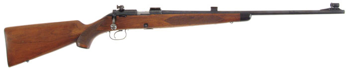 *WINCHESTER MODEL 52B SPORTER. Cal. 22 LR. SN 58543B. Fine sporting rifle with 24” tapered rnd bbl, ramp front sight with Lyman 17A globe sight, and a Mod 70 Lyman 48 WJS receiver sight. Bbl & receiver ring are mounted with scope blocks & the rear bridge is drilled & tapped with a plug screw. Mounted in a 1-pc nicely figured, checkered stock with black forend tip & capped pistol grip butt with checkered steel buttplate. It has deluxe sling swivel bases. Forestock is checkered in triple diamond pattern and the triggerguard is marked “SPORTING”. Accompanied by one five round magazine. CONDITION: Fine to very fine. Metal retains 95-96% strong, bright, orig blue with slight muzzle edge wear and a small flaked spot or two with a few scattered very small spots of pitting on the left side of receiver. Wood is sound with a few small gouges on the left side with a scrape on the cheek piece and a bruise on the comb. Retains about 90% strong orig varnish. Checkering shows moderate wear. Mechanics are fine. Bright shiny bore. 4-60659 (2,500-3,500)