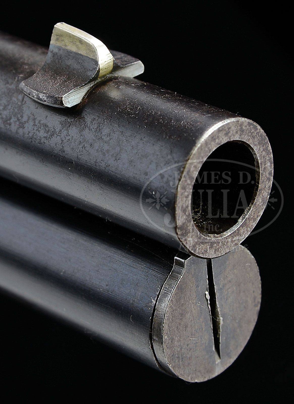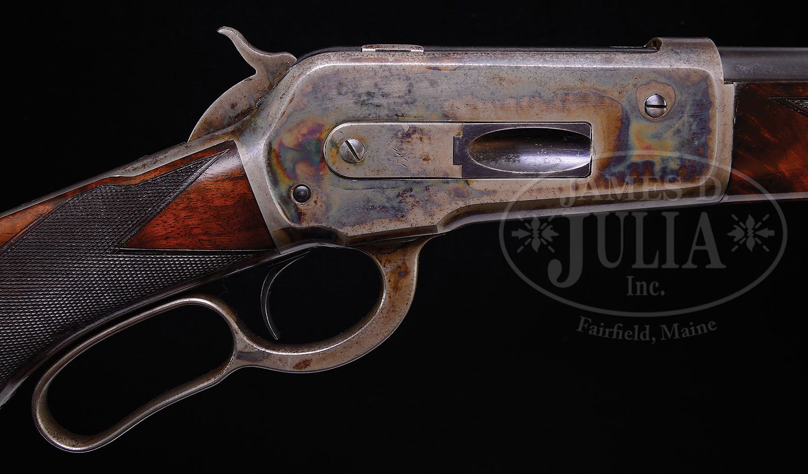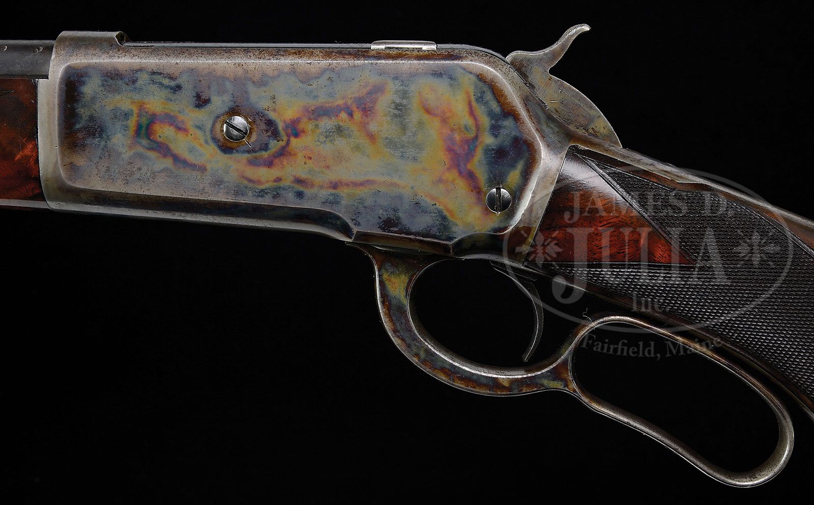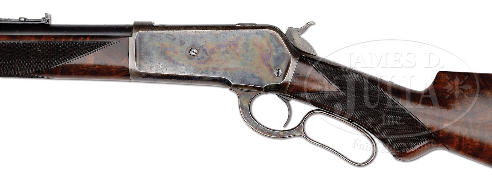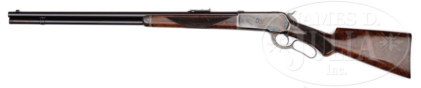 SCARCE SPECIAL ORDER DELUXE WINCHESTER MODEL 1886 LIGHT WEIGHT LEVER ACTION RIFLE. SN 91508. Cal. 45-70. Scarce ’86 with 26″ extra light rnd bbl, full mag, half nickel front sight and 1873 marked 1000 yard rifle ladder rear sight. Mounted with very highly figured, 3X plus American walnut with H-style checkered forearm and black insert serpentine grip buttstock and Winchester hard rubber buttplate. Left side lower tang is marked with the assembly number “2”, “XXX”, and “RB”. Matching assembly number is also found in top tang channel of buttstock. Accompanied by a Cody Firearms Museum letter which identifies this rifle in cal 45-70 with rnd bbl, plain trigger and shotgun butt pistol grip stock, received in warehouse Sept 11, 1894 and shipped the same day to order number 19658. CONDITION: Very fine to extremely fine, all matching. Bbl retains 94-96% orig blue with fine freckling over the top and a series of small dings on right side about mid-point. Mag tube retains about 98% strong orig blue and the forend cap about all of its brilliant case colors. Receiver retains brilliant case colors on left side, strong bright colors on right side and moderately faded colors on bottom with distinct second coating lines, faded to faint colors mixed with silver and freckling over the top edges, bolt and top tang. Hammer retains strong case colors on sides, faded, with freckling on top and rear edges. Lever retains brilliant case colors on left side, moderately faded on right side with brilliant case colors in sheltered areas on faces, mostly turned silver. Stock has a small chip in the bottom left edge of the tang channel, otherwise wood is sound with a very few, very light handling and storage nicks and scratches and retains virtually all of its orig, brilliant piano varnish finish with some very light staining on the right side at the buttplate. Mechanics are crisp, bright shiny bore. 4-47169 (17,500-27,500)