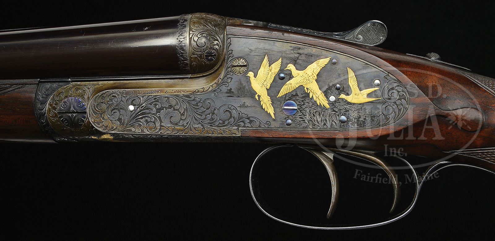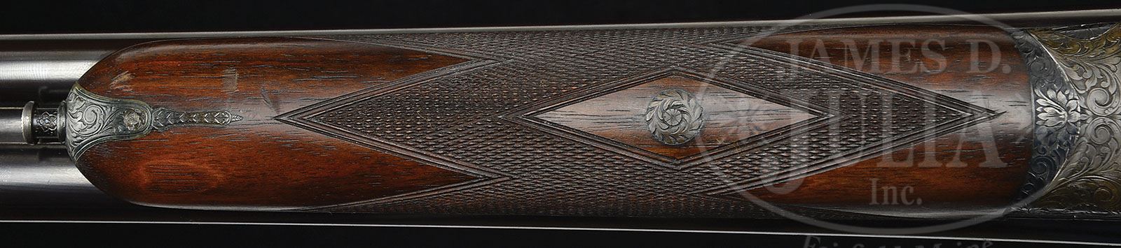 *VERY FINE PETITE 20 GAUGE JAMES PURDEY GAME GUN ENGRAVED AND GOLD INLAID BY KEN HUNT WITH CASE. SN 27388. (1966) Cal. 20 ga. 2-3/4″ Chambers. 26″ Chopper lump bbls with flat, narrow, matted rib, are engraved “J. Purdey & Sons.” and “AUDLEY HOUSE. SOUTH AUDLEY STREET. LONDON. ENGLAND.” on tops. Bbl flats are stamped with London nitro proofs for 2-3/4″ chambers. Bottoms of bbls are stamped with SN. Bottom right bbl is stamped with initials “G.W.” (George Wood, barrel maker). Tube nos. “68621” and “68622” are on loop. Small, case hardened, Beesley patent, self-opening action features automatic safety (SAFE inlaid in gold), bushed strikers, raised rib tumbler end cocking indicators, and double triggers. Action is engraved with very well cut and nicely laid out, large, semi-relief, open, shaded scroll with acanthus and strap work highlights. A well detailed gold inlaid cocker spaniel retrieving a quail bounds across bottom of action. This very fine scroll spills over onto lockplates, which also have scenes of game birds gold inlaid in appropriate field backgrounds; trio of doves is on left lockplate; and quail on right. All of this fine work is by highly regarded master engraver, Ken Hunt, whose signature appears under scenes on both lockplates. His initials are under spaniel on bottom of action. “J. Purdey & Sons” is on each side of action above lockplates. Fences are engraved with somewhat deeper relief scroll. Blued top lever and trigger guard are engraved with scroll matching action. Trigger guard tang is engraved with SN and extends to grip cap. Well figured, and finely marbled European walnut full capped pistol grip buttstock measures 13″ over checkered wood butt, and features drop points, point pattern checkering with mullered borders, hard rubber grip cap, and vacant gold oval on toe line. Matching splinter ejector forend has Anson release. Actioners initials “T.B” are stamped on iron. Bore diameter: left-.614, right -.614. Bore restrictions: left -.004 (IC), right -.002 (IC). Wall thickness: left -.032, right -.036. Drop at heel: 2″, drop at comb: 1-1/2″. Weight: 5 lbs. 8 oz. LOP: 13″. Makers motor case with stitched leather corners is embossed “Mrs C. L. Fitzgerald Greenwich, Conn.” on top. Interior is lined in burgundy cloth with makers label on lid. Case contains a 2-pc walnut and brass cleaning rod. CONDITION: Excellent, near new. Bbls retain 95 – 98% orig blue with a few minor marks and light scratches. Action retains 90% + orig case hardening color, silvered on beads and tips of fences. Lockplates retain nearly all of their color. Top lever, forend iron, and trigger guard are only slightly silvered. Hinge pin and tumbler ends retain nearly all of their fire blue. Stocks retain nearly all of their orig rubbed oil finish, with a few light marks from occasional field use. There is a somewhat deeper small dent on forend behind tip. Bores are excellent, bright and shiny throughout with no visible imperfections. Action is tight. Bbls are on face. Ejectors are in time. Case leather is excellent with some light scuffs and one or two deeper scratches. Straps and handle are very fine. Interior cloth is excellent, with a few rubs. A finely built and finished gun, light and lively. Perfect for someone of small stature, or for almost anyone, with the addition of a pad. 4-48684 MGM40 (40,000-60,000)