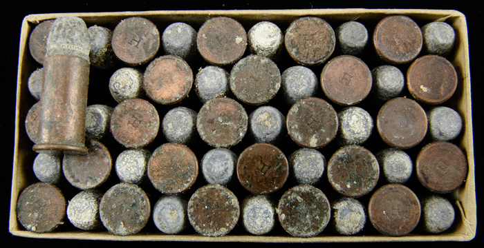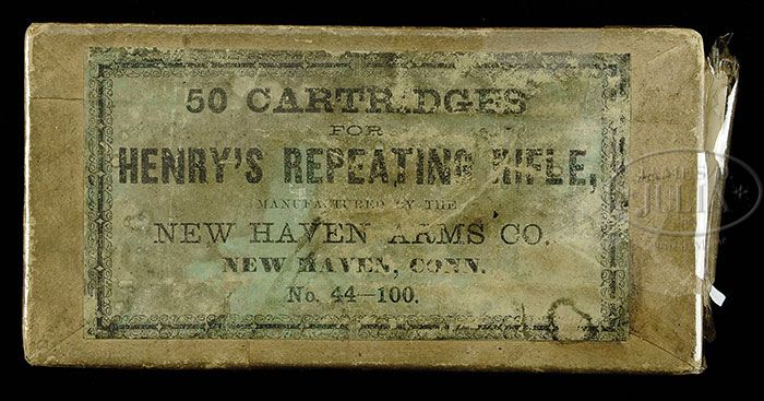 Correction: Cartridges are wrong for this box, it should be short case with raised “H” headstamp and have pointed bullets. Correction: Please Note: The description is correct. Photo is incorrect. See photo for 1222D for images of this rare Henry ammo and box. SCARCE EARLY BOX OF NEW HAVEN ARMS 44 RIMFIRE HENRY AMMUNITION. Very early full box of New Haven Arms 44 Henry ammunition with small green label with black lettering and decorative border. Box has plastic wrap and was not checked for contents. According to One Hundred Years of Winchester Cartridge Boxes, Giles & Shuey, 1856-1956, this style of box is second in rarity only to the black label boxes and was produced 1862-1863. CONDITION: Very good. Label is mostly intact showing moderate wear with all legends & information completely legible; label shows heavy fading, soil & water staining; bottom of box has a piece of paper tape on each side edge, otherwise box appears to be completely intact. 4-46192 JR360 (5,000-8,000)