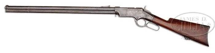 RARE IRON FRAME HENRY MODEL 1860 LEVER ACTION RIFLE. SN 197. Cal. 44 RF Henry. Usual configuration with 24-1/4″ oct bbl with integral magazine tube and slightly altered orig German silver front sight with 1,000 yard Henry ladder rear sight, missing its slide. Henry’s Patent and New Haven arms 2-line address are of the small letter type and completely legible. Receiver & sideplates are of iron with a second dovetail in the top flat of the receiver. Mounted with nicely figured, slab-sawed American walnut that has a bottom mounted sling swivel with a sling loop on right side of bbl. SN was observed in the usual place on the top flat of the bbl between rear sight & receiver. It is also found on left side of lower tang, under the wood, inside top tang channel of buttstock and inside buttplate tang. Buttstock has the large hole for wood cleaning rod and also has a groove down the bottom of the hole. Top of the rnd section of the bbl, under the rotating sleeve, is marked with assembly number “146” which number is also found on rear face of rotating sleeve. Right side of rotating sleeve is screw-mounted with a saber bayonet lug. All screws are matching numbered. Pages 184-186 of The Henry Rifle, Quick, pictures a similar bayonet lug on an early Henry rifle, similarly mounted on right side of rotating sleeve but of a longer style for the “Bahn Frei” bayonet. Both of the lugs utilize a similar catch with the one in the picture having the notch on the bottom vs. notch on the top of this rifle. Information contained in the referenced publication states that there were less than 400 of these iron frame Henrys produced very early in the production run with no. “355” the highest SN known. Mr. Quick also reports that the general consensus among knowledgeable collectors & dealers is that the iron frame & brass frame Henrys were produced simultaneously and that there were probably substantially less than 400 ever made. The chart in the referenced publication on pp. 54 & 55 show a duplication of 16 SNs between iron & brass frame rifles out of 167 rifles surveyed. This same panel of experts concluded that this duplication was simple bookkeeping errors. This rifle has all of the correct early features including the German silver front sight, 1,000 yard ladder rear sight, sharp radius at top rear of receiver, small loop finger lever without locking spur, slight perch belly stock and the large cleaning rod recess. CONDITION: Fine to very fine, all matching. Bbl retains a smooth even plum blue/brown patina with some mottling in the gullet on the right side; receiver retains a plummy blue/brown patina with silver patina showing through; top edges of sideplates are slightly battered as is the bottom of the carrier; trigger return spring has a replaced screw. Stock is sound with light nicks, dings & scratches and a chemical streak from the bottom tang to the buttplate and overall retains most of its fine orig varnish. Mechanics are fine, strong bore with good shine and scattered pitting. 4-46197 JR257 (75,000-125,000)