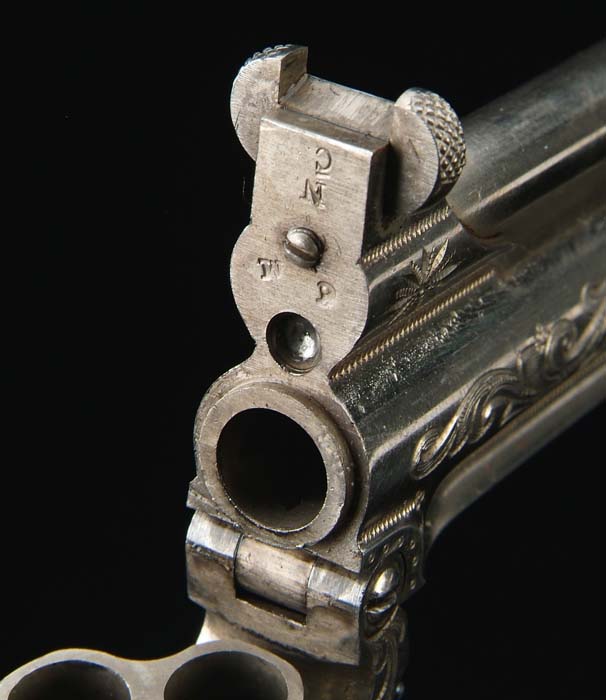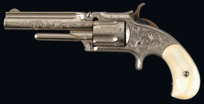 CASED “NIMSCHKE” ENGRAVED & SIGNED SMITH & WESSON MODEL 1-1/2 NEW MODEL SPUR TRIGGER REVOLVER. Cal. 32 RF. SN 114732. Nickel finish with 3-1/2” keyhole bbl, usual markings on top rib with half moon front sight & spectacular birdhead, 2-pc pearl grips that are numbered on inside “114703”. These are undoubtedly factory grips and fit perfectly. It has about 60% coverage, fine, intertwined foliate arabesque engraving with punch dot background by L.D. Nimschke and signed “L.D.N” on toe of front strap and with a small “N” inside face of bbl lug. Accompanied by an orig M.W. Robinson, red wool lined, distributor’s case, compartmented in bottom for revolver, a scarce box of UMC 32 short No. 2 rimfire cartridges with orange label and a picture of this exact model of revolver. There are five loose rds in another compartment. CONDITION: New & unfired, all matching. Retains all of its orig factory nickel on revolver and brilliant case colors on hammer. Grips are spectacular with a tiny chip at right side near the frame, otherwise are near perfect with tremendous fire & color. Mechanics are crisp, bright shiny bore. Case has light storage nicks & scratches with no cracks or grain checks. Interior is lightly faded with some mothing in lid and a spot or two in bottom with some light soil in bottom. Altogether a very rare set. 4-30711 JR426 (12,500-17,500)