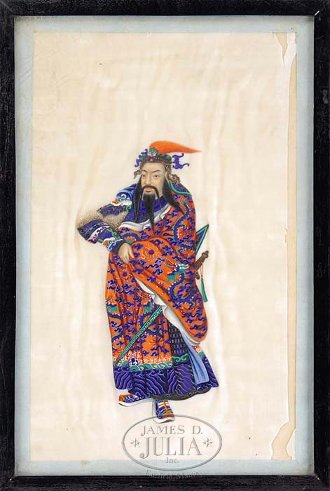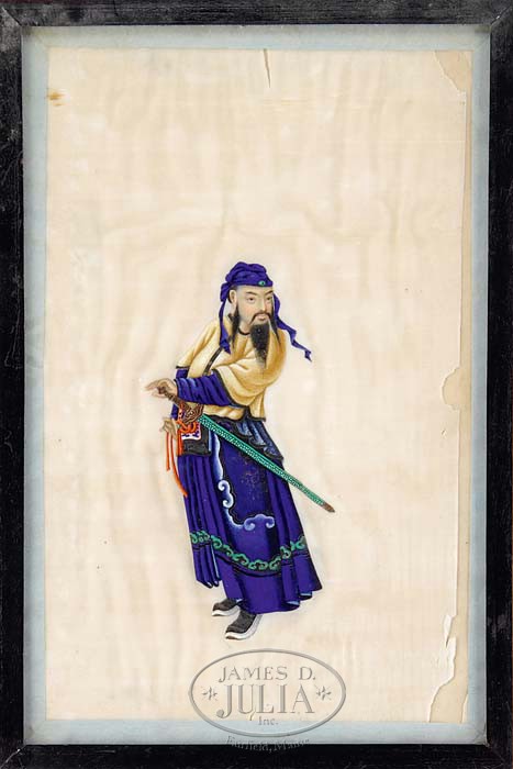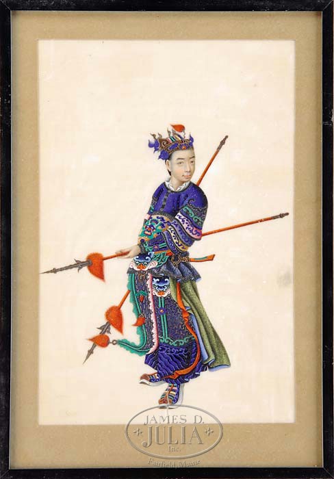 FOUR CHINA TRADE GOUACHES OF WARRIORS. Each gouache on pith paper depicting a warrior of the period in brilliant color, rendered in an exceptional 3-dimensional manner. Probably four from a larger series and possibly from the studio of Sunqua (Act. 1830-1865). Each framed and labeled by a German framer. SIZE: Sight: 10″ x 6-1/2″. CONDITION: All with some deterioration and/or damage to background paper. Three figures totally intact, figure with two pikes has area of damage in proper left foot. 9-92324 (300-500)