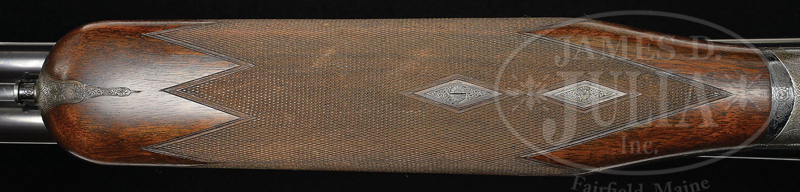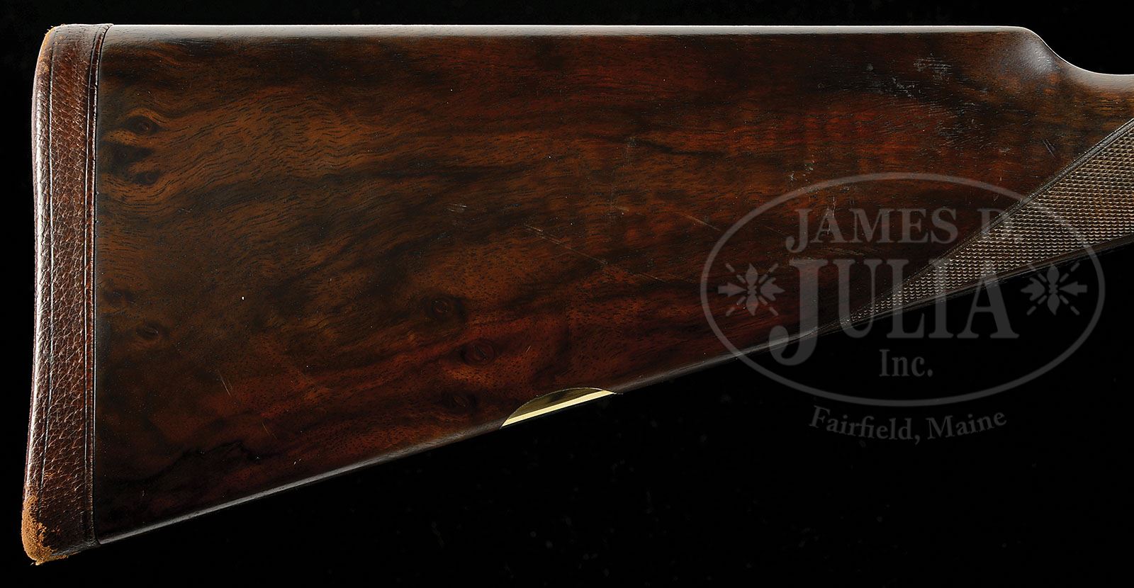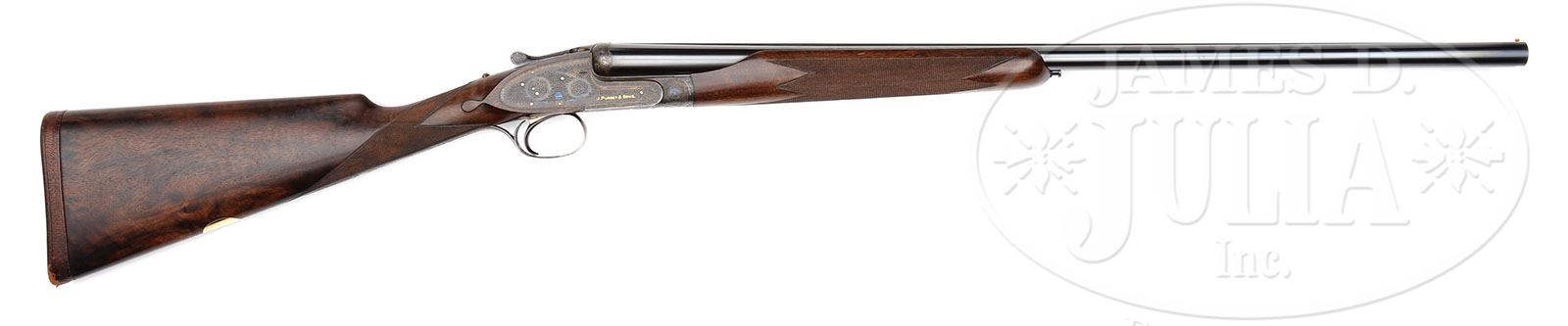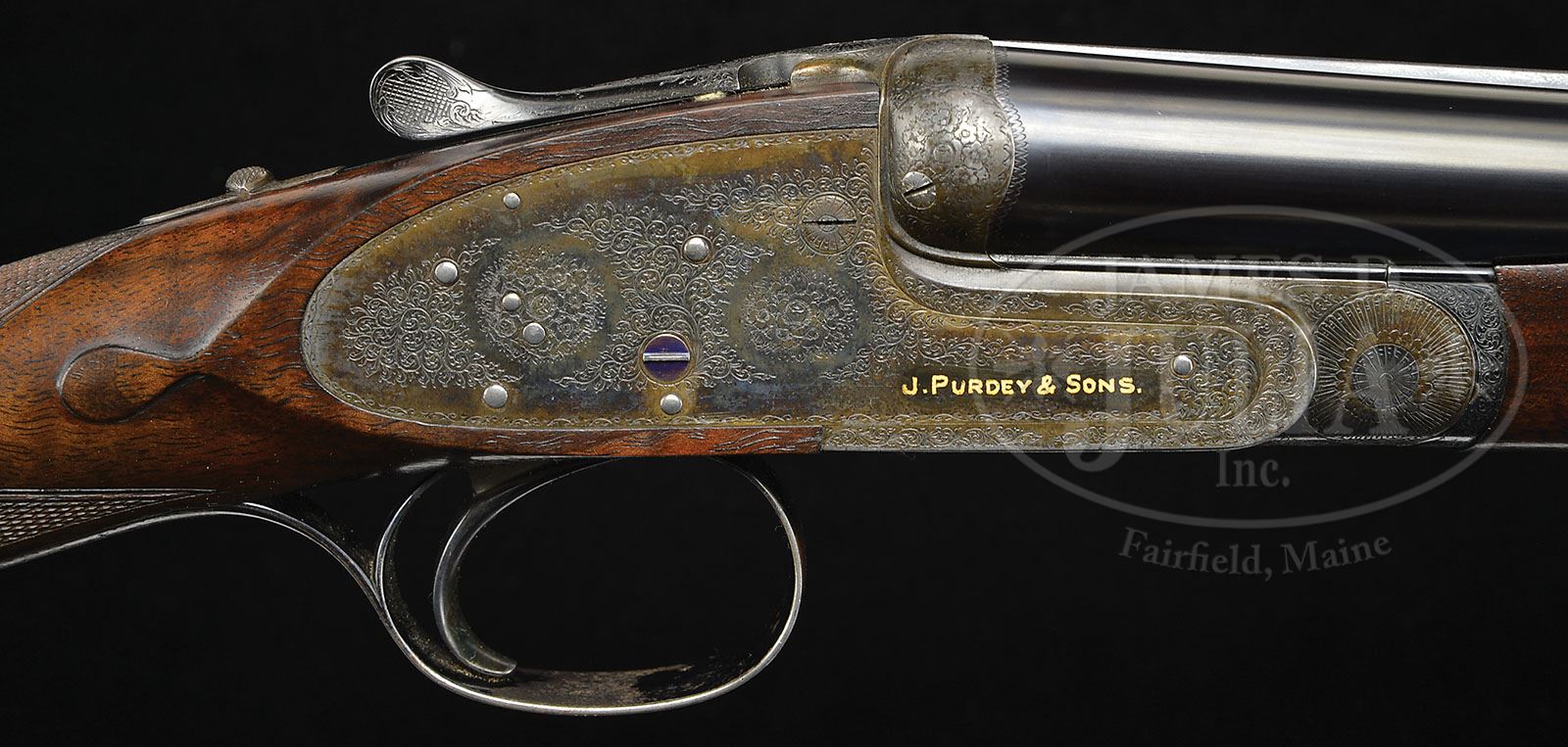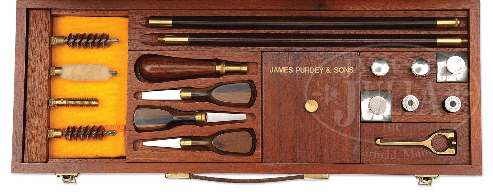 *JAMES PURDEY HEAVY PROOF LIGHT GAME GUN WITH CLEANING KIT. SN 26428. (1953) Cal. 20 ga. 2-3/4″ Chambers. 26″ Chopper lump bbls with raised, narrow, matted rib, are engraved “J Purdey & Sons.” and “Audley House South Audley Street London. England.” on tops. Bottoms of bbls are stamped with London nitro proofs for 20 ga. 1 oz of shot, and “2-3/4”. Bottoms of bbls are each stamped “Choke” and with SNs. Bbl makers initials “J.A” (J. Aldous) are on left bbl. Tube nos. “65883” and “65884” are on loop. Case hardened, Beesley patent, self-opening, sidelock action features hidden third fastener, side clips, bushed strikers, raised rib tumbler end cocking indicators, non-automatic safety (SAFE inlaid in gold), and Purdey non-selective single trigger. Action and lockplates are engraved in very well cut, small, shaded scroll with rose bouquet highlights in Purdey house style, most probably the work of Ken Hunt who was working exclusively for Purdey’s at the time of manufacture of this gun. “J. Purdey & Sons” is inlaid in flush gold at the front of each lockplate, and engraved on bottom of action with the addition of “London England”. Small bow trigger guard is engraved with classic open scroll, and with SN at grip. Dark, well fiddle figured, and nicely marbled European walnut straight grip buttstock measures 14″ over thin, reddish, leather-covered pad, and features classic point pattern checkering with mullered borders, drop points, and a large vacant gold oval on toe line. Large beavertail ejector forend has Anson release, and actioners initials “B.D” (Ben Delay) are stamped on iron. Bore diameter: left-.615, right -.615. Bore restrictions: left -.025 (I Mod), right -.010 (IC). Wall thickness: left -.032, right -.031. Drop at heel: 1-15/16″, drop at comb: 1-7/16″. Weight: 6 lbs. 1 oz. LOP: 14″. Also included is a Purdey mahogany cased cleaning kit, with leather strap handle. Interior is lined in green felt, with small gold embossed Purdey label, containing an array of accessories and cleaning equipment, including 3-pc rosewood and brass cleaning rod, with two brushes, mop, and jag, three unmarked walnut handled turnscrews, two Purdey marked oil bottles, two unmarked striker cases, an unmarked 20 ga stuck case remover, and a pair of Purdey marked 20 bore snap caps, and some cleaning patches, under removable cover with brass knob, marked “James Purdey & Sons”. CONDITION: Excellent. Bbls retain approx 98% orig blue, with a few marks on sides from contact with forend. Action retains 95% orig case hardening color, silvered slightly on beads and fences. Lockplates retain nearly all of their color and original varnish, which has considerably darkened and should be refreshed. Trigger guard is flaking to silver on bow, and has wear at grip. There is some oxidation inside of bow from finger contact. Stock retains most of its orig finish with a number of minor scratches and marks. Leather of recoil pad is beginning to rub and wear through at heel and toe. Bores are excellent, bright and shiny throughout. Action is tight. Bbls are on face. Ejectors are slightly out of time. Cleaning kit is excellent, some scratches and loss to veneer on cover, accessories, etc. unused. This fine gun, obviously made by long term Purdey gunmakers, is in need of a good cleaning. 4-48989 MGM63 (30,000-50,000)