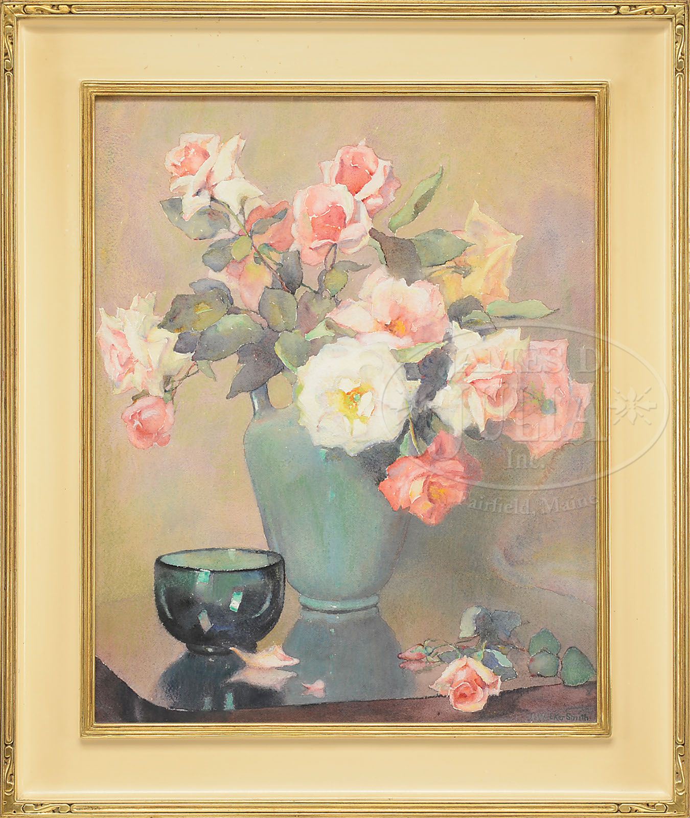 MINNA WALKER SMITH (American, 1883-1960) STILL LIFE OF ROSES. Watercolor on paper Housed in its original painted & gilt carved wood frame with glass Signed lower right “M Walker Smith” SIZE: Sight: 19-1/2″ x 15-1/2″. Overall: 25-1/2″ x 21-1/2″. PROVENANCE: Inherited by descent, from the family who bought the house and contents belonging to Nathan Clifford (US Supreme Court Justice; Atty Gen. of US Ambassador to Mexico). CONDITION: Very good. 9-27765 (400-800)