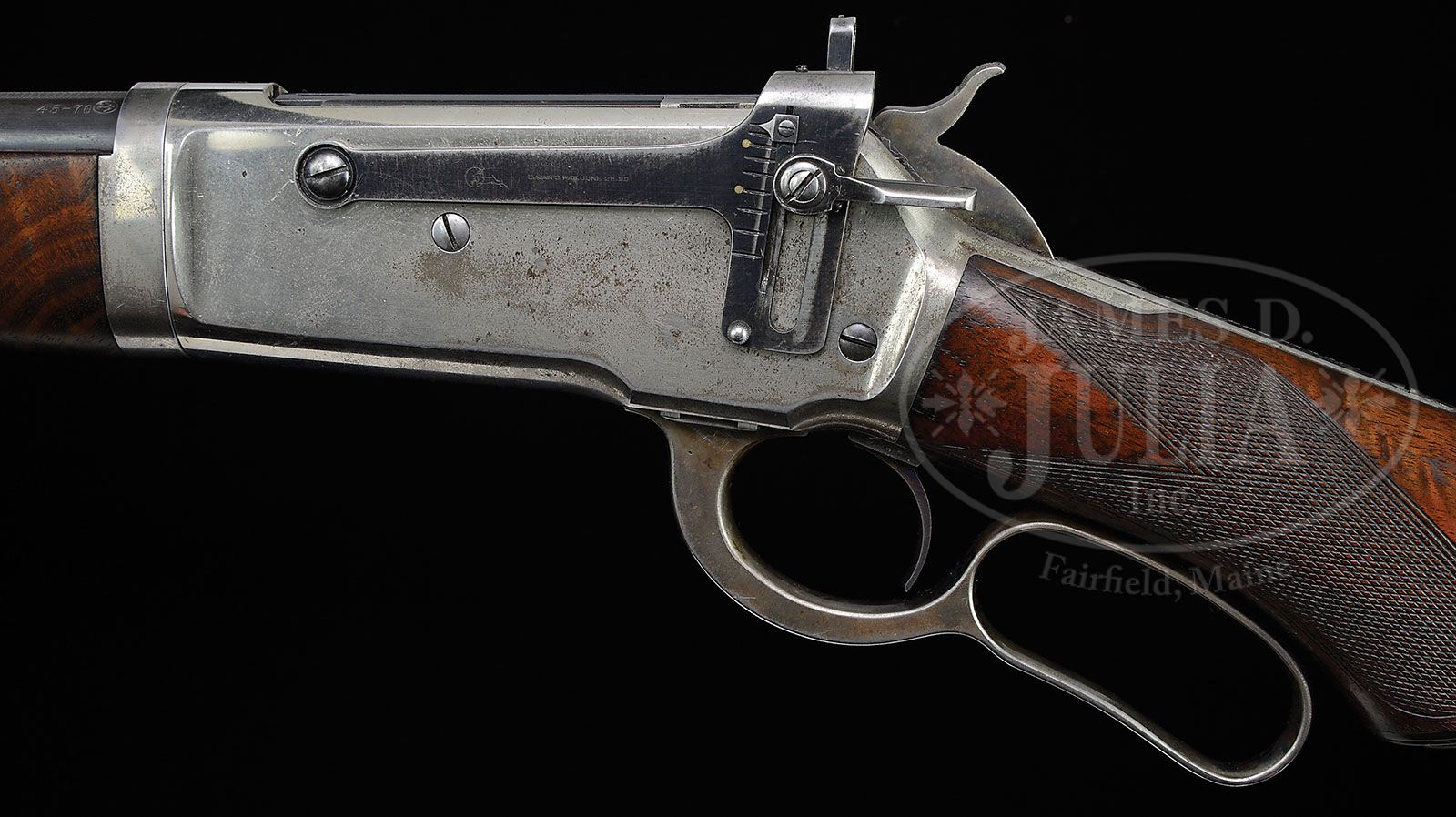 *RARE WINCHESTER SPECIAL ORDER DELUXE LIGHTWEIGHT TAKEDOWN MODEL 1886 LEVER ACTION RIFLE. SN 123332. Cal. 45-70. Rare deluxe ’86 with 24″ extra-light rnd bbl with full matted top, pedestal mounted ivory bead Jack front sight, 2-leaf Lyman Model 6A folding rear sight and a Lyman 21 combination receiver sight, half magazine and takedown. Mounted with highly figured, about 2X American walnut with H-style checkered forearm and capped pistol grip stock that has nickel plated Swiss buttplate. Left side of lower tang, under the wood, is marked with assembly number “939” and “XX”. Matching assembly number is also found in the top tang channel of the buttstock and inside toe of buttplate. This rifle has the additional rare feature of being half nickel with nickel plated receiver, buttplate, forend cap & takedown ring. Accompanied by a Cody Firearms Museum worksheet which identifies this rifle in caliber 45-70 with 24″ matted rnd bbl, plain trigger, checkered pistol grip stock, half magazine, takedown and Swiss buttplate, received in warehouse Feb. 19, 1901 and shipped next day to Order #86675. It was returned & repaired 8-15-1912 with no indication of the type of work accomplished. A former owner states that the return & repair was for the nickel plating and Lyman 21 receiver sight. A note on the bottom of the worksheet states that “Roger Bean’s grandfather was a doctor. He ordered it from Winchester with Lyman 21 receiver sight.” Sights are not mentioned in the worksheet information. CONDITION: Very fine, all matching. Bbl retains 88-90% thinning & slightly dulled orig blue and the magazine tube retains blue in sheltered areas having flaked, not worn, to a light patina; receiver retains about 90% orig nickel, slightly dulled with fine flaking on the sides and wear on the bottom; takedown ring & forend cap retain most of their orig nickel and the buttplate about 95% orig nickel with wear mostly on the quillions; hammer retains strong case colors, turned silver on top edge; lever retains faded case colors in the most sheltered areas being mostly turned to silver. Wood is sound showing light nicks & scratches and a series of chips in the finish on right side of buttstock, with the buttstock, overall retaining about 90% orig varnish that is slightly heat crazed; forearm is equally sound with a few nicks & scratches and retains about 80% strong orig varnish showing wear on bottom at the carry point and moderate diamond point wear. Mechanics are fine, strong bore with good shine & moderate pitting. 4-47171 (20,000-30,000)