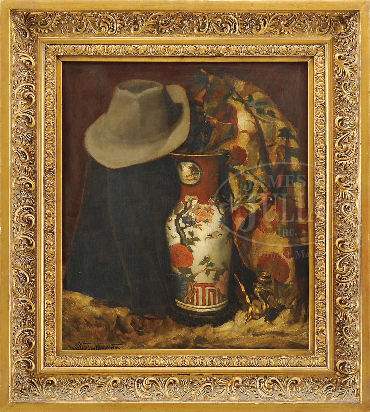 STANLEY GRANT MIDDLETON (American, 1852-1942) STILL LIFE WITH ORIENTAL VASE. Oil on canvas Housed in a copper type gilt fancy frame Signed lower left SIZE: 24″ x 20″. CONDITION: Very good 9-22804 (1,000-2,000)