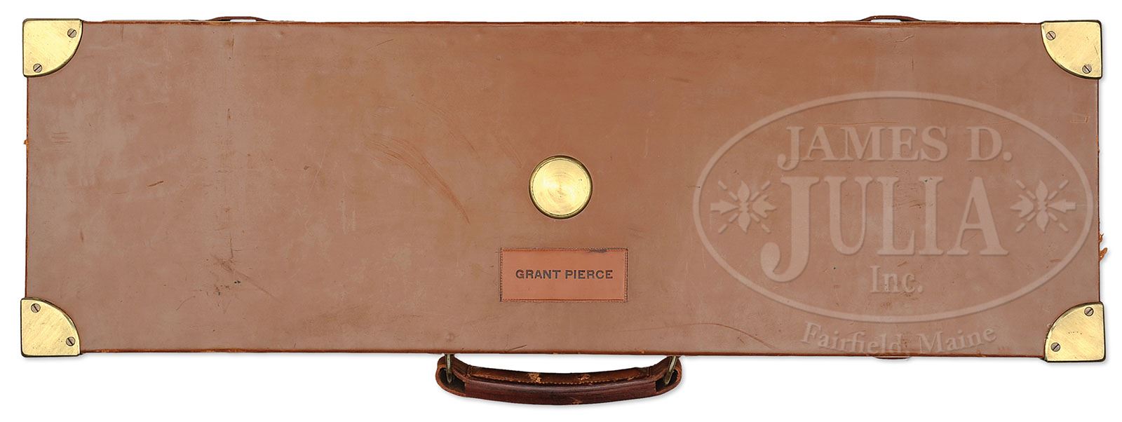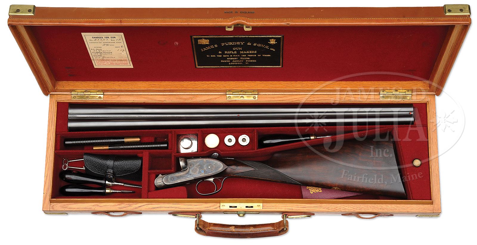*EXCEPTIONALLY FINE JAMES PURDEY SIDELOCK EJECTOR SINGLE TRIGGER LIGHT GAME GUN WITH ORIGINAL CASE AND ACCESSORIES. SN 23737. (1927) Cal. 12 ga. 2-3/4″ Chambers. 27″ Chopper lump bbls are engraved “James Purdey & Sons. Audley House. South Audley Street. London.” and “Made of Sir Joseph Whitworth’s Fluid Pressed Steel” on narrow, deeply swamped game rib, fitted with red front and mid beads. Bbl flats are stamped with London nitro proofs for 1-1/8 oz of shot and “2-5/8″”. Bottoms of bbls are stamped with SN. Bbl maker’s initial “H” (for long time Purdey craftsman William Hill) is on bottom of left bbl. Splinter is engraved “Made in England”. Tube nos. “58724” and “58725” are on loop. Case hardened, Beesley patent, self-opening, sidelock action features automatic safety (SAFE inlaid in gold), bushed strikers, raised rib tumbler end cocking indicators, and Purdey non-selective single trigger. Action and lockplates are engraved with exceptionally well cut small scroll with rose bouquet highlights in “house” style. “J. Purdey & Sons” is at the bottom of each lockplate, and also on bottom of action over “London”. Small bow trigger guard is engraved with medium scroll and with SN at grip. Well figured and nicely marbled, dark European walnut straight grip buttstock measures 14-3/8″ over checkered wood butt, and features standard point pattern checkering with mullered borders, drop points, and a gold oval on toe line engraved “G. P.” Matching splinter ejector forend has Anson release. Iron is stamped with actioners initials “FH” (Fred Hughes). Bore diameter: left-.734, right -.735. Bore restrictions: left -.007 (IC), right -.008 (IC). Wall thickness: left -.031, right -.030. Drop at heel: 2-1/4″, drop at comb: 1-3/8″. Weight: 6 lbs. 1 oz. LOP: 14-3/8″. Maker’s oak and leather case with brass corners and push button latch has round brass central medallion and inset leather tag embossed with an early owner’s name on top. Front of lid is embossed “Made in England”. Interior is lined in scarlet cloth with gold embossed black leather Purdey label and charge card (for this gun) on lid. Case contains two 2-pc rosewood and brass cleaning rods with brush, mop, jag, and Turks head, pull through cleaning kit in black morocco wallet, action cleaning brushes in red morocco wallet, broken case extractor, 2 black wood handled turnscrews, striker disc tool, bone striker case with spare strikers, Purdey marked square oil bottle, and snap caps. Also included is a booklet “Instructions for Purdey Guns”, an inventory of items in case, and two keys. PROVENANCE: Abercrombie & Fitch tag with specifications and price of $875.00 affixed to trigger guard. CONDITION: Excellent. Bbls retain nearly all of a fine London quality re-blue with spot on rear left side of left bbl where cleaned of slight rust. Action retains 60 – 70% orig case hardening color, silvered on bottoms and beads. Lockplates retain 85 – 95% orig case hardening color, left being the strongest. Top lever and forend iron retain most of their orig blue, slightly silvered. Trigger guard re-blued and retains nearly all of that blue. Stocks retain nearly all of their orig rubbed oil finish with a number of minor marks, and a few somewhat heavier, from normal handling and use. Checkering is slightly worn and dark. Incipient 1/4″ crack is behind left lockplate. Bores are excellent, smooth, bright and shiny throughout. Action is tight. Bbls are on face. Ejectors are in time. Trigger works. Case leather is excellent, with little discoloration,and a few bumps and rubs. Straps and handle are good. Interior is excellent, with some rubs and soiling from contact with gun. Label is excellent. Charge card is slightly foxed. Accessories are very fine. Pamphlet is slightly squished from being fit to case. A very fine, well balanced, fast handling, high condition gun from the 1920’s. 4-48363 MGM38 (15,000-25,000)