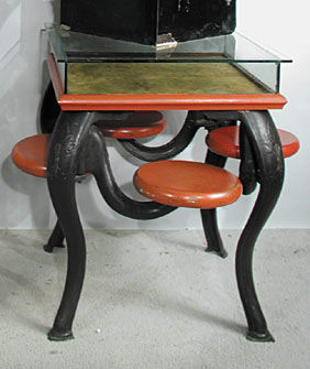 ANTIQUE CAST IRON BASE SODA FOUNTAIN DISPLAY TABLE. This very scarce yet highly popular soda fountain table features a glass display case top, cabriole shaped cast iron legs and swing out round seats which store under the table when not in use. Seats four people. SIZE: Approx. 26″ x 26″. Height to top of case is approx. 32 1/2″. CONDITION: Quite nice with old restored paint. 1-27662 (1,000-2,000) Auction: Advertising, Toy & Doll - Fall 2001 Please Note: All prices include the hammer price plus the buyer’s premium, which is paid by the buyer as part of the purchase price. The prices noted here after the auction are considered unofficial and do not become official until after the 46th day. |