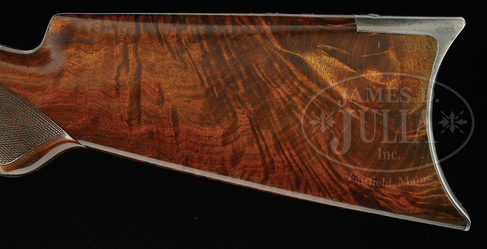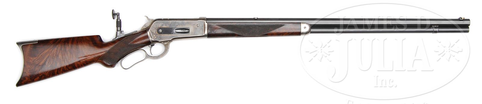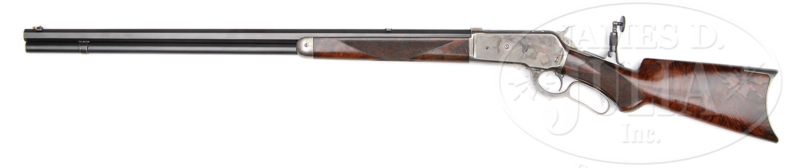 SPECIAL ORDER DELUXE WINCHESTER MODEL 1886 LEVER ACTION RIFLE. SN 48361. Cal. 38-56 re-bored to .45-70. Fine deluxe ’86 with special order 28″ oct bbl, full magazine, gold washed Beech’s combination front sight, a slot blank in the rear seat and Lyman tang sight with windage in the base and folding aperture. Left side of receiver has two extra plugged holes. Lower tang is mounted with a sgl set trigger. Left side of lower tang, under the wood, is marked with assembly number “197” and “XX”. Matching assembly number is also found in top tang channel of buttstock and inside toe of buttplate. Mounted with very highly figured, center crotch, about 3X, flame grain American walnut with H-style checkered forearm and black insert serpentine grip buttstock with crescent buttplate. This rifle would make an outstanding and classic hunting gun. CONDITION: Fine to very fine, all matching. Bbl & magazine tube retain about 98% crisp professionally restored Turnbull-style blue with only faint sharp edge wear and a minor nick or two; front sight retains about all of its orig gold wash on the loop; receiver retains faded case colors on sides and over the top, faded to silver on bottom; lever & hammer also retain faded case colors, turned silver on outer faces of lever; buttplate retains smoky case colors. Wood is sound with a few light handling & storage nicks and overall retains about all of a professionally restored finish. Mechanics are fine, bright shiny bore. 4-47350 JR140 (6,000-9,000)